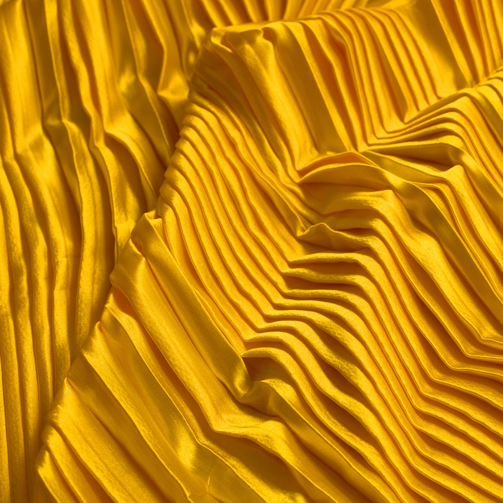Elevate your wardrobe to the gold standard with this Gamboge Pleated Stretch Satin! Sporting a smooth and soft face, a modestly structured drape, and a fun accordion pleated design with a fair amount of stretch along the weft, it's ideal for A-line skirts, maxi skirts, empire dresses and more! Opaque in nature, a lining isn't needed but may be used in instances where additional structure is desired.Please be aware that this collection of pleated fabrics is measured and cut with an open pleat.