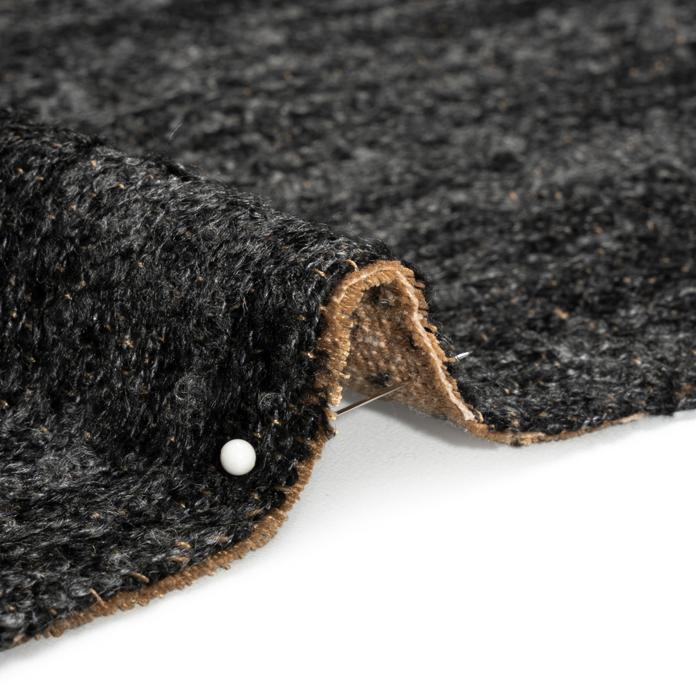 Nestle yourself into the plush texture of this Avenir Onyx Striated Plush Upholstery Boucle! Bouclé is known for its distinct face, textured by irregular loops. This specific bouclé colors its semi-lustrous loops with long, thin streaks of dark gray and black, as traces of golden-brown threading weaves itself through the warp. Surprisingly malleable and wonderfully medium-weight, this fabric softens offices, warms up living rooms, and textures bedrooms. Create a cozy atmosphere with accent chairs, matching ottomans, sectionals, and more!