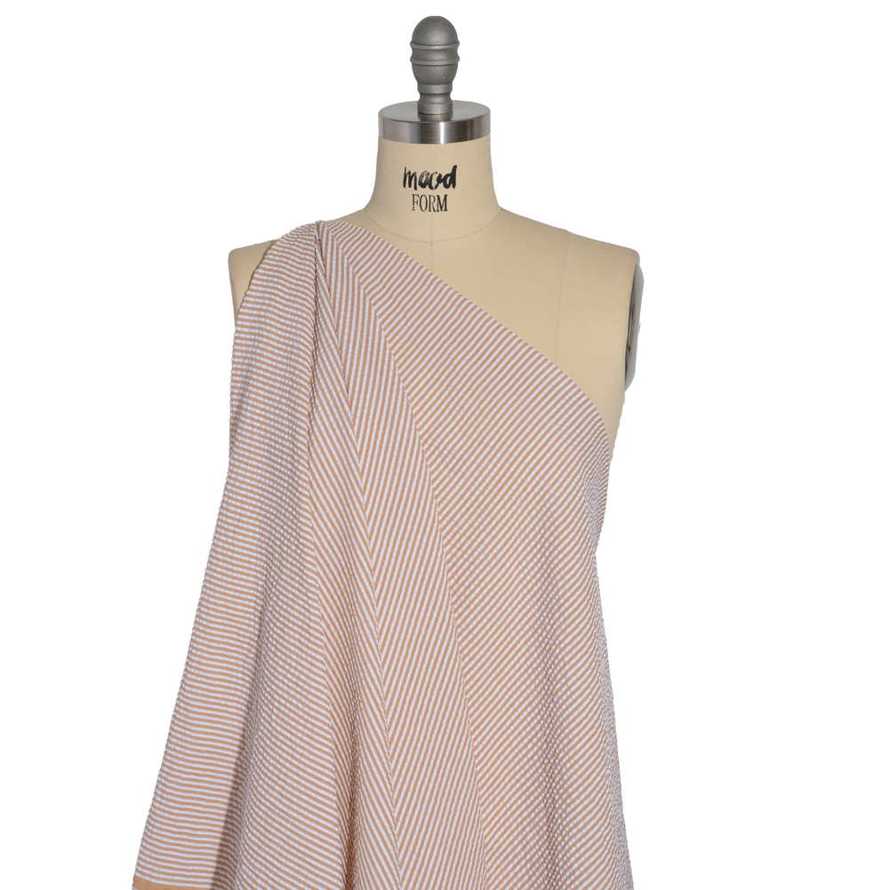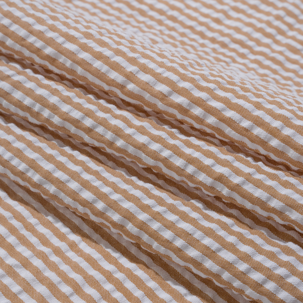 Have a little fun with your neutrals with this Wylie Khaki and White Candy Striped Polyester and Cotton Seersucker! The lightweight nature of seersuckers make them a functional fabric for warm weather climates; the puckered face feels cool on your skin as the easy drape catches the breeze. Often seen in stripes or checkers, this specific seersucker is lined with tan and white candy cane stripes—a simple yet playful demonstration of color. Touching upon Americana, preppy, and nautical fashion trends, this versatile, gender-neutral fabric is perfect for both old and young, semi-formal and casual occasions, and everything in between. Don’t sacrifice your style for the sake of staying cool; create breathable button-ups, cute dresses, paper bag pants, comfortable blazers, and more! Slightly translucent, a lining may be desired for added opacity and structure.