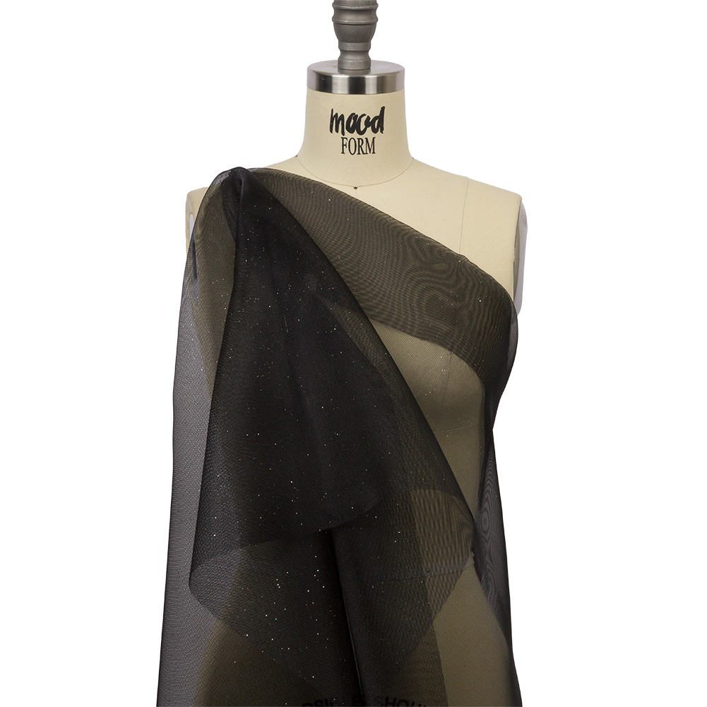 Not sure what color to get? Stick to the classics with this Starlight Black Polyester Mesh Organza with Silver Glitter. Silver glitter shines from the luminous surface of an organza with a slightly open weave, giving it a mesh-like quality. In addition to a crisp, almost grainy hand, it features a full, voluminous drape perfect for sculptural elements. Create evening gowns, mermaid-style prom dresses, tutus, and small gift bags. As this material is translucent, a lining may be added for additional opacity where desired.