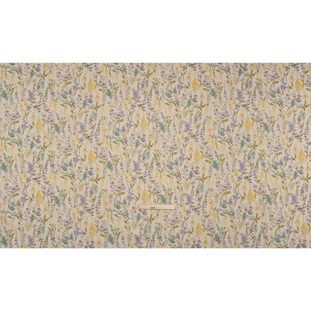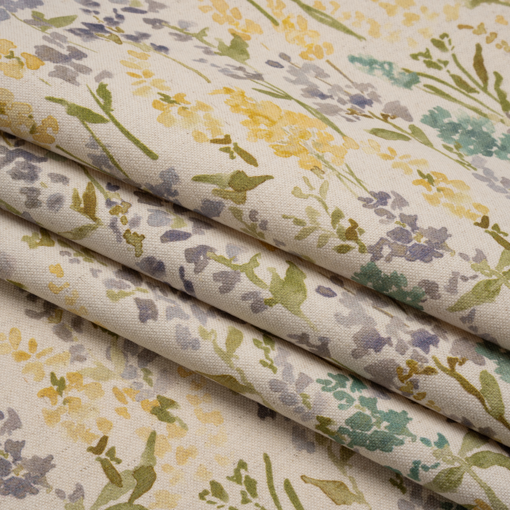 Pick a bouquet of this Heather Painterly Flowers Printed Cotton and Linen Canvas—featuring a smooth, lightly tactile hand and semi-structured drape.Suggested Projects: Armchairs, Couches, Headboards, DraperiesContent: 85% Cotton, 15% LinenStretch: NoneOpacity: Mostly OpaqueA floral masterpiece is painted across this natural beige canvas in watercolor hues of heather purple, turquoise, yellow, and green. The artist in you is drawn to canvas—a fabric that sways between rustic and refined, offering itself easily to living rooms, kitchens, bedrooms, and even wardrobes. With a smooth, lightly tactile hand and semi-structured drape, it’s ideal for upholstery and drapery projects like armchairs, headboards, and curtains, or go the fashion route with structured jackets and tote bags! While mostly opaque, a lining will increase opacity and structure.