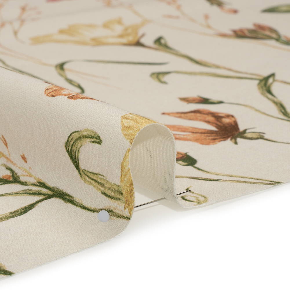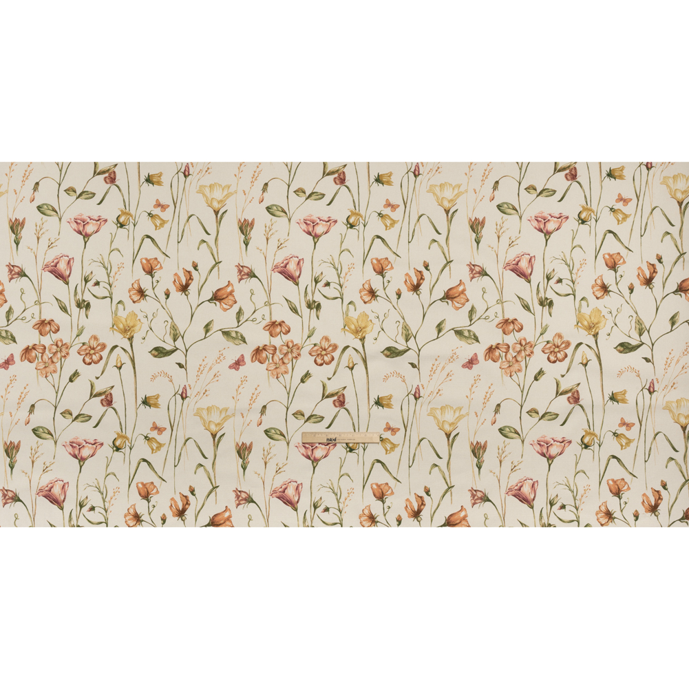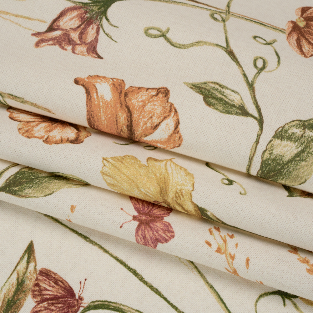 Before the winter chill blows through, preserve this Autumn Flowering Stems and Butterflies Printed Cotton Canvas to gaze upon year-round—featuring a smooth, lightly tactile hand and semi-structured drape.Suggested Projects: Curtains, Throw Pillows, Headboards, JacketsContent: 100% CottonStretch: NoneOpacity: Slightly TranslucentA budding botanist’s keen eye delicately sketches flowers, butterflies, and greenery in rich autumnal yellow, orange, dusty rose, brown, and green hues, all flourishing against a pale beige canvas. The artist in you is drawn to canvas—a fabric that sways between rustic and refined, offering itself easily to living rooms, kitchens, bedrooms, and even wardrobes. With a smooth, lightly tactile hand and semi-structured drape, it’s ideal for drapery and light upholstery projects like headboards, throw pillows, and curtains, or go the fashion route with structured jackets and tote bags! Slightly translucent, a lining will increase opacity and structure.