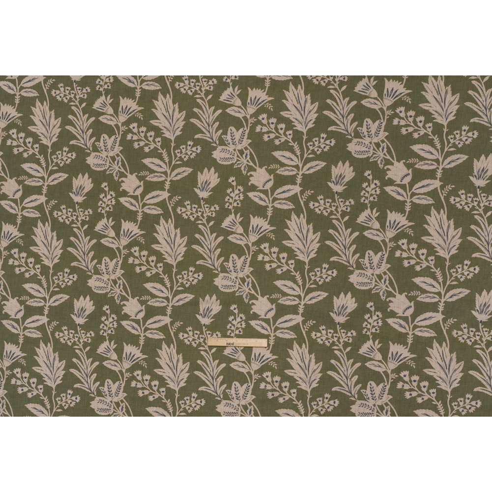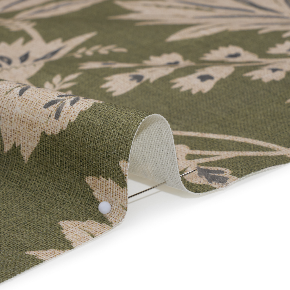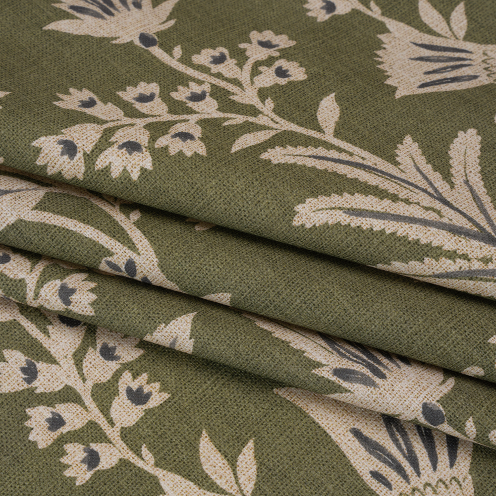 Feel like a forest fairy when surrounded by this Moss Leafy Sprays and Little Flowers Printed Cotton Canvas—featuring a smooth, lightly tactile hand and semi-structured drape.Suggested Projects: Armchairs, Couches, Headboards, DraperiesContent: 100% CottonStretch: NoneOpacity: Mostly OpaqueAcross an earthy moss green canvas, delicate beige leaves and tiny blossoms unfurl, swaying as if caught in a gentle breeze, their intricate silhouettes enhanced with stormy gray accents. The artist in you is drawn to canvas—a fabric that sways between rustic and refined, offering itself easily to living rooms, kitchens, bedrooms, and even wardrobes. With a smooth, lightly tactile hand and semi-structured drape, it’s ideal for upholstery and drapery projects like armchairs, headboards, and curtains, or go the fashion route with structured jackets and tote bags! Mostly opaque, a lining will increase opacity and structure.