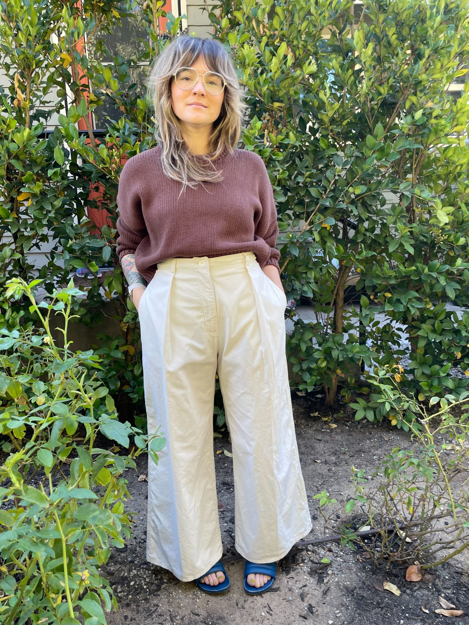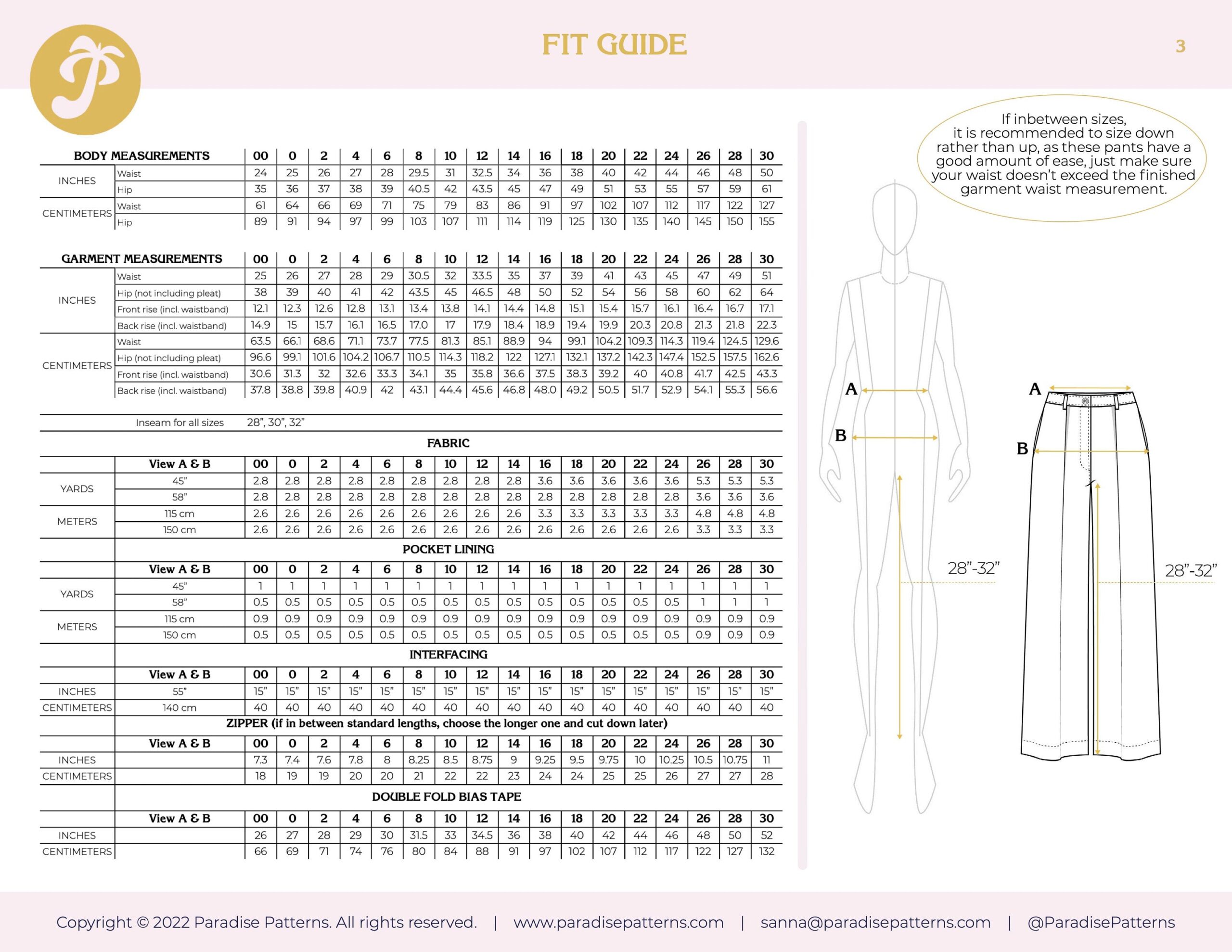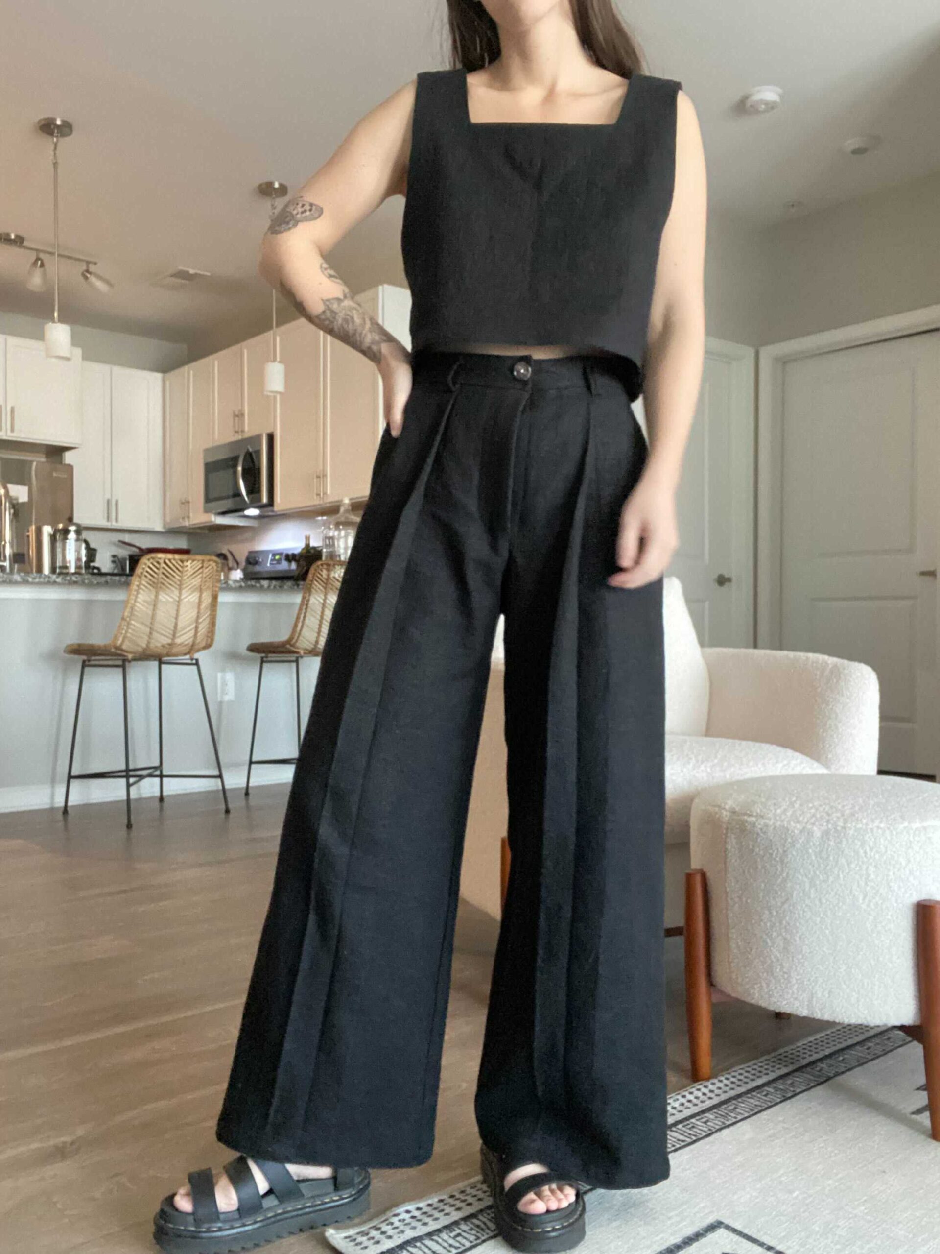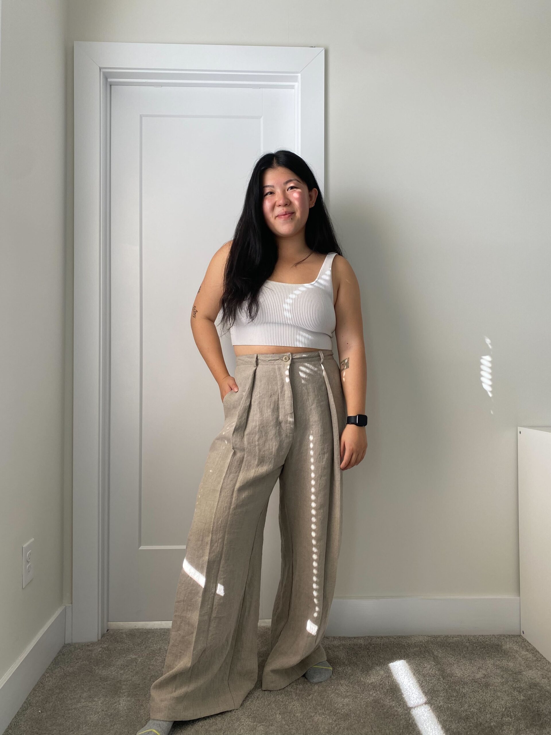 These trousers will have a completely different look depending on the fabric you choose, but I do recommend something with a good drape and also something that doesnโ€™t grow as you work with it or wear it. A light, drapey fabric will look lovely and flowy. A mid-weight cotton/linen will look so relaxed and cool. Or you can choose a mid-to heavyweight for a chic winter pant. You wonโ€™t need pocket lining fabric or pocket facing if using lightweight fabric, in that case you can use your main fabric.