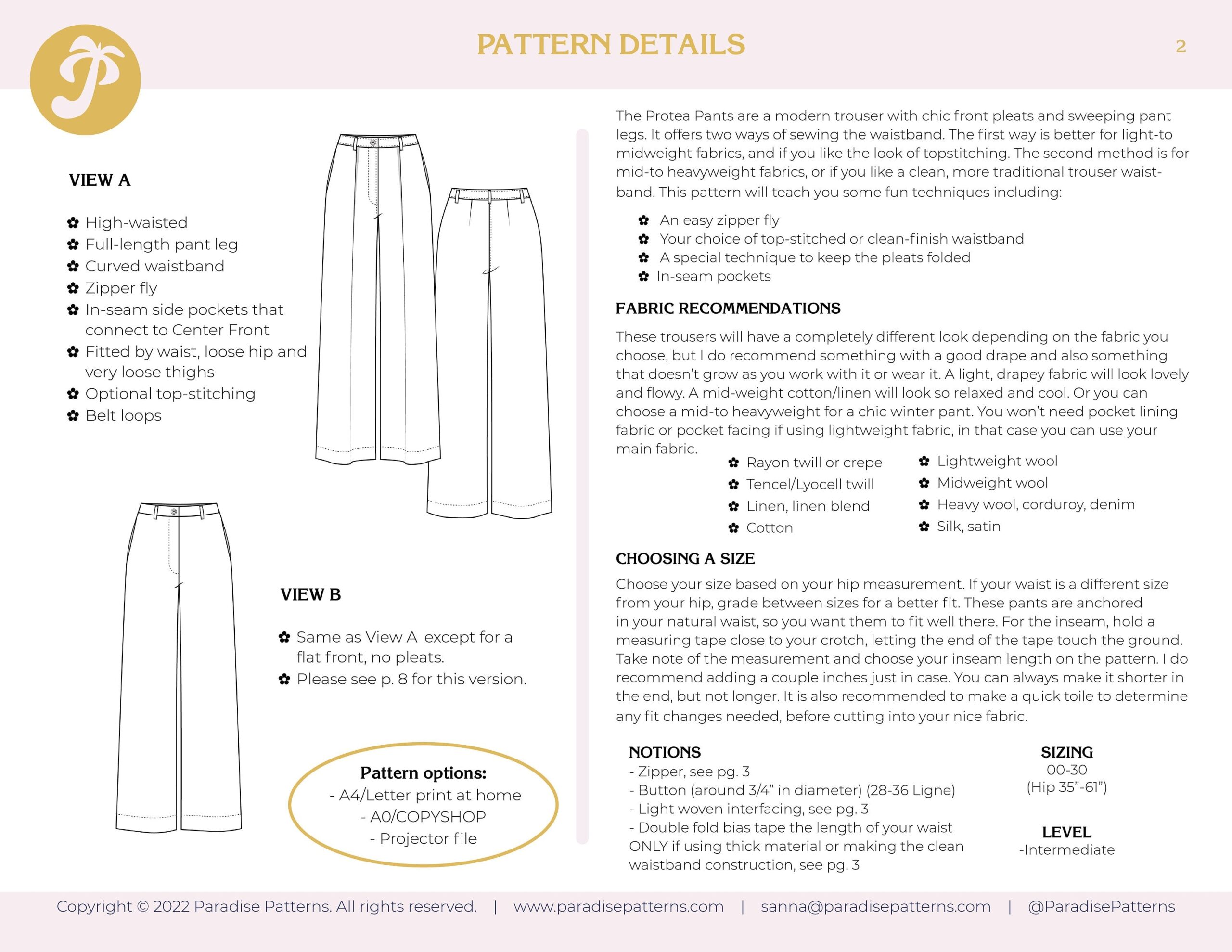 The Protea Pant is a modern trouser with chic front pleats, sweeping pant legs, and a curved waistband. It offers two ways of sewing the waistband. The first way is better for light-to midweight fabrics, and if you like the look of topstitching. The second method is for mid-to heavyweight fabrics, or if you like a clean, more traditional trouser waistband. View A has pleats in front, View B has a flat front. This pattern will teach you some fun techniques including: