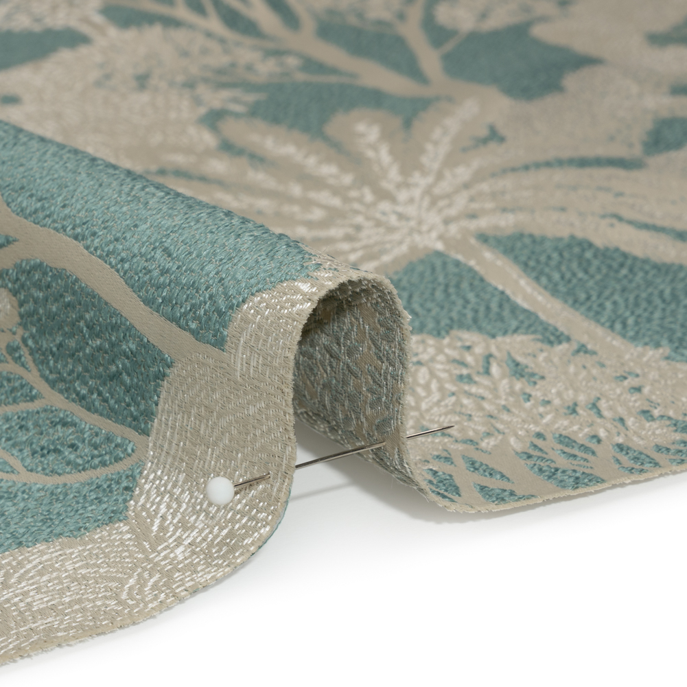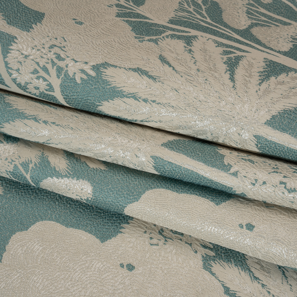 A jungle expands on this Seafoam Jungle Trees Drapery Jacquard, yielding a dimensional hand and sleek feel. Made of recycled polyester, it’s as good for the environment as it is for your interiors!Suggested Projects: Bed Canopies, Curtains, Valances, DrapesContent: 70% Recycled Polyester, 30% PolyesterStretch: NoneOpacity: Mostly OpaqueEnjoy the high energy of this aqua and silver Jacquard in your home! The metallic shine of the tropical trees pairs with the lustrous sky for a texture-driven, luxury-focused fabric. Lauded for their sophisticated look, Jacquards constantly deliver a delicious dimension that resembles embroidery, thanks to a specific loom used in production. Light in weight and with a supple drape, this textile is a favorite in formal dining rooms, elevated living rooms, and mature bedrooms. Slightly transparent; a lining may be desired for complete opacity.