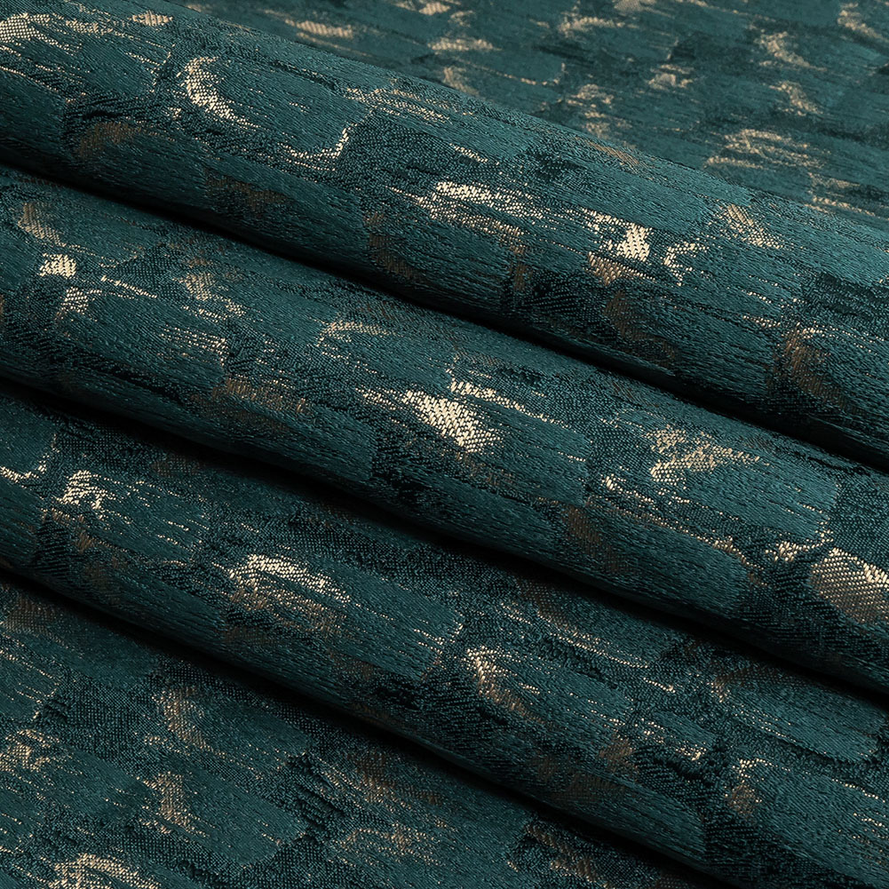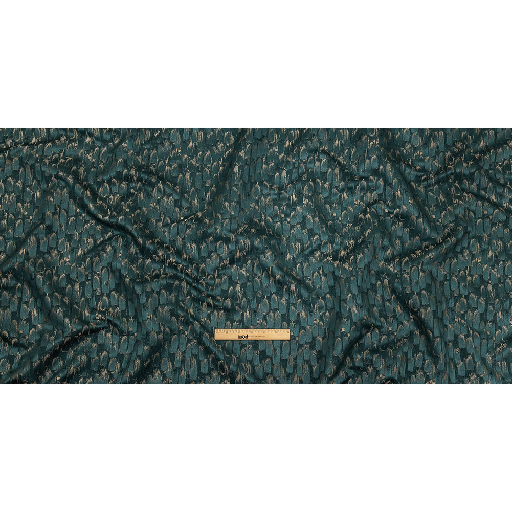 The poised emerald peacock is a sight to behold. Feathered smudges of gold and green masterfully decorate this elegant British Imported Peacock Abstract Recycled Polyester Jacquard. Evoking palette-knife paintings, this textural Jacquard features abstracted brushstrokes forming diamonds against a satin-faced ground. Pliable and semi-structured, we suggest fashioning statement draperies, creating table runners and throw pillows, or upholstering stools and statement benches. Somewhat translucent, a lining may be desired for complete opacity.MoodEarth Verified: This fabric is made with recycled materials, which are made from post-consumer waste that is transformed into raw fibers, producing a high-quality, eco-friendly fabric. For more information on Mood's sustainability initiatives, check out MoodEarth here.
