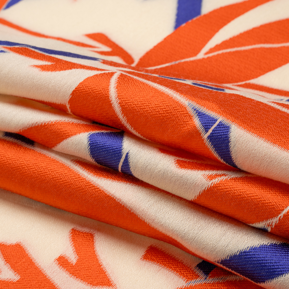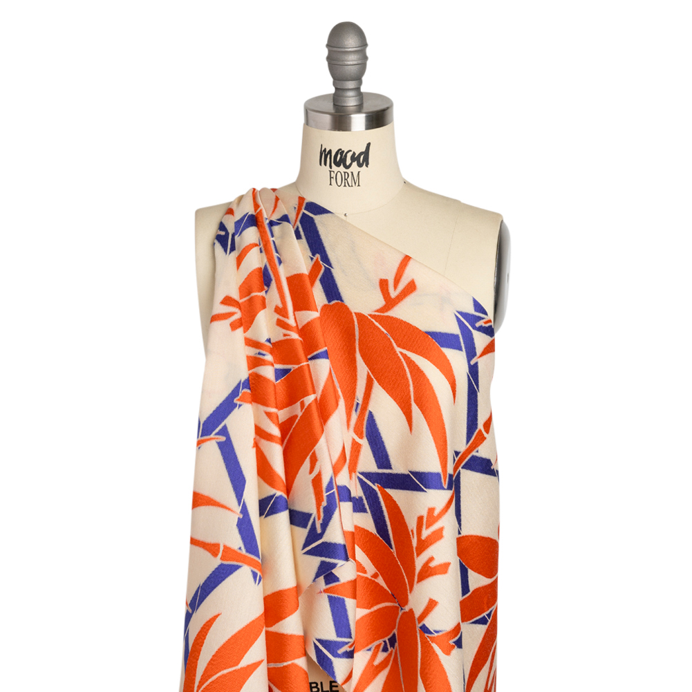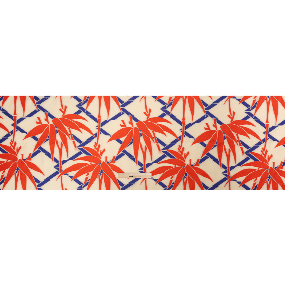 Bring to life colorful creations with this Red, Blue and Beige Bamboo Lattice Lightweight Polyester and Viscose Luxury Brocade! Royal blue bamboo shoots cross in the cream background as bright orange trees grow upfront. While the colored sections add a slight texture variation to the face, the hand is overall sleek and cool. This lightweight, lustrous brocade falls with an easy drape, conjuring images of semi-structured silhouettes and long, flowing garments. Create structured blazers, handkerchief skirts, perfectly tailored gowns, and more! As this fabric is slightly translucent, we suggest lining it with our silk habotai linings for added opacity and luxury!