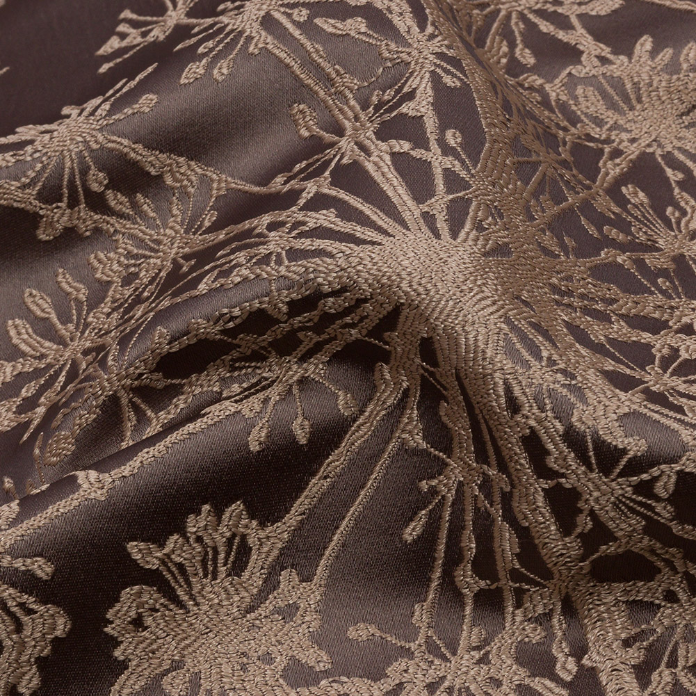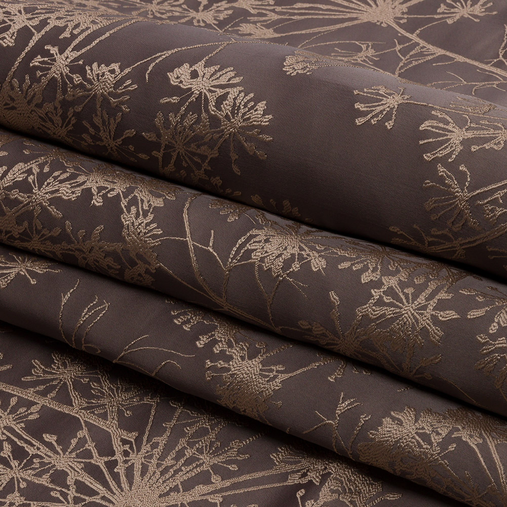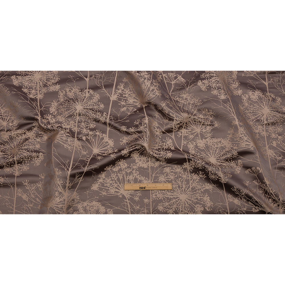 As rich and smooth as mocha is this British Imported Mocha Fennel Flower Satin Faced Drapery Jacquard. An overgrown garden of beige fennel flowers cast their silhouettes against a warm, brown base. The Jacquard weave and satin face creates a luminous sheen and a tactile yet smooth hand. The overall weight, feel, and drape of this fabric exudes an undeniable luxury. Falling with flexibility and without stretch, decorate your living room with dramatic drapes or elevate your dining room with elegant swags and valances. Explore upholstery projects like throw pillows, headboards, and more. Completely opaque, a lining may only be necessary for added structure.
