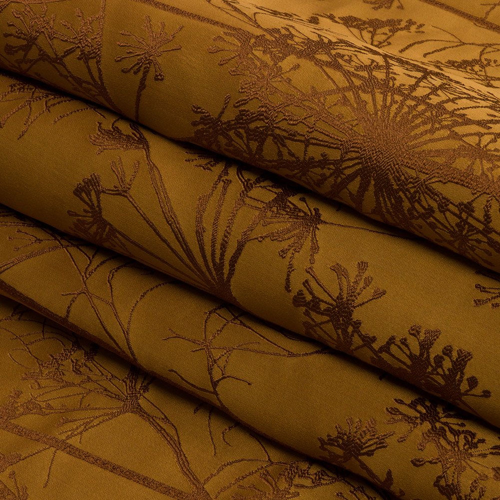 This British Imported Yellow Ochre Fennel Flower Satin Faced Drapery Jacquard captures the beauty of nature during golden hour.