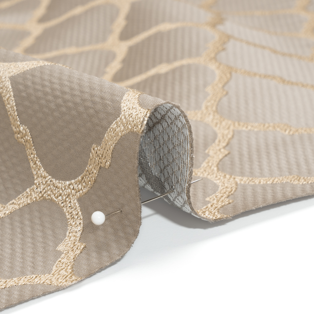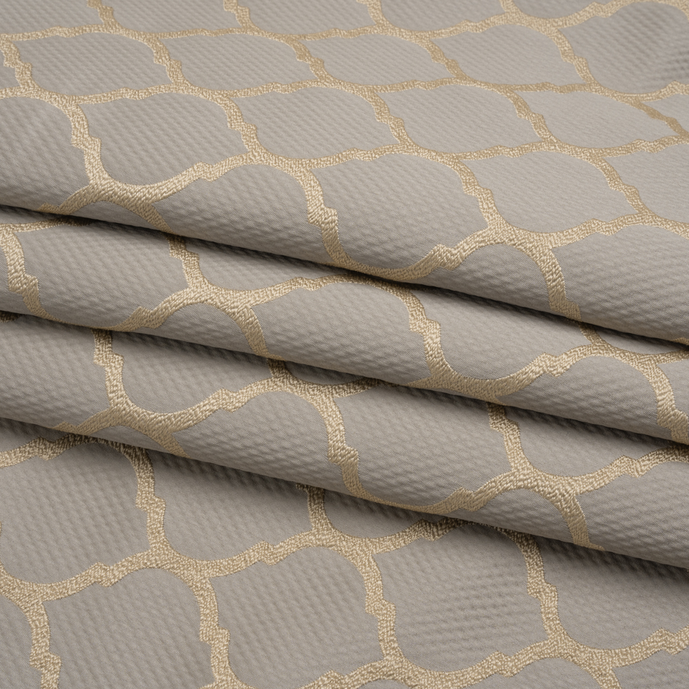 Find your shine with this British Imported Pewter Moroccan Quatrefoil Satin-Faced Jacquard! A taupe lattice pattern rises over a shimmering gray ground with a subtle waffle texture. A sumptuous collection of textures with a voluminous drape makes a fabric that’s ideal for adding a luxe touch to your home decor. Create stately drapes, regal curtains, and swags and valances that would make anyone jealous. While this material is excellent at blocking light on its own, adding a drapery lining can only help; plus, it will protect the fibers from sun damage and fading.