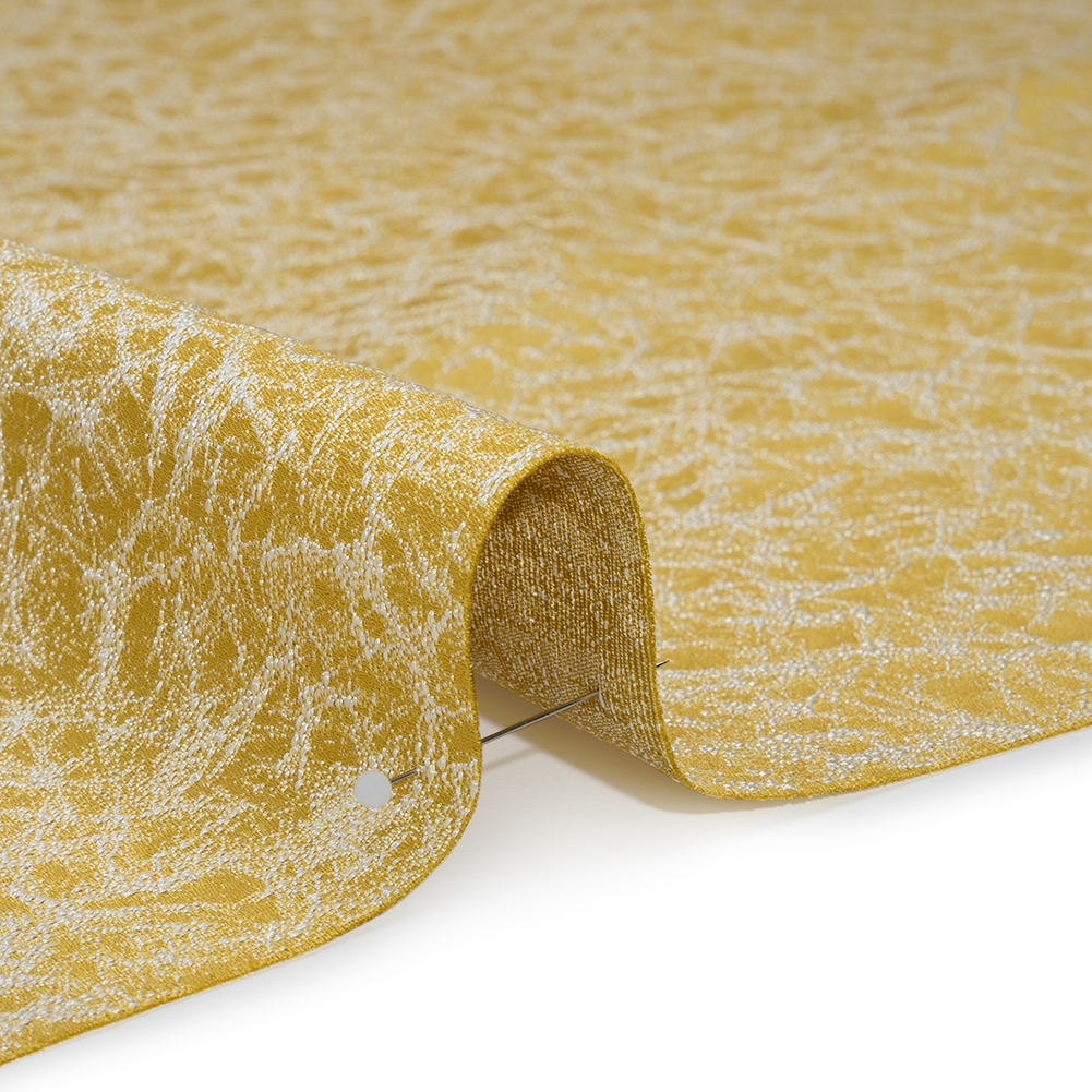 Liven up your interior with this Zest Cracked Satin-Faced Jacquard. With a soft, tactile hand and voluminous drape, take a crack at using this fabric for your next home project.Suggested Projects: Drapes, Curtains, Table Runners, Light UpholsteryContent: 83% Recycled Polyester, 17% PolyesterStretch: NoneOpacity: Slightly TranslucentAll your days will be bright when you have this zest yellow jacquard. The embroidered cracked design featured on this jacquard creates a wrinkled, distressed look adding both texture and dimension to your space. Its satin-like, bright yellow face is matched with a luminous off-white letting its pattern pop. Thin with a medium weight, its versatility can take it from curtains to light upholstery to table runners! Play with both texture and pattern within your design theme and pair this lovely jacquard with a velvet for a modern look. Note that it is slightly translucent.