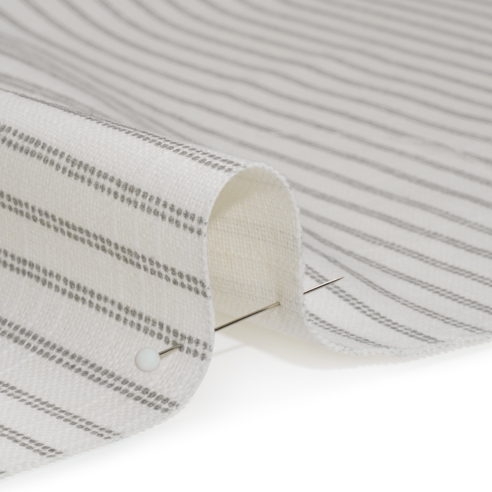 This British Imported Steel Candy Striped Printed Slubbed Cotton Canvas reminds you that simplicity is power! Small gray dots line up into rows across a white background. This softly slubbed fabric is semi-translucent and falls with a malleable drape—a lining will increase opacity, structure, and sun protection.The artist in you is pulled to canvas, a versatile fabric that presents itself like art, curating ease and refinement in your home. This simple pattern charms spaces with long curtains and inspires light upholstery projects (like throw pillows and headboards)—plus, in admiration of its stability, wardrobes can be refreshed with structured jackets and tote bags!