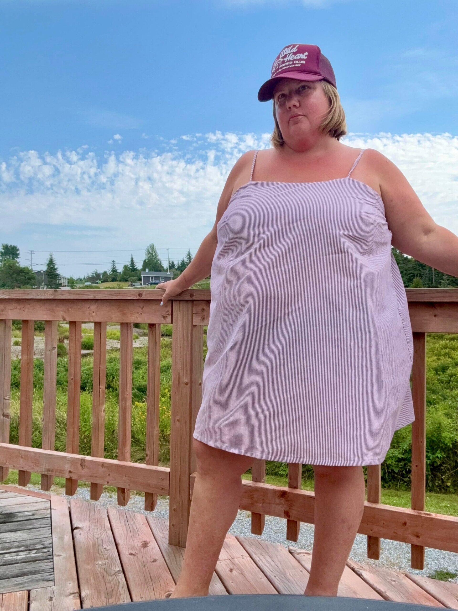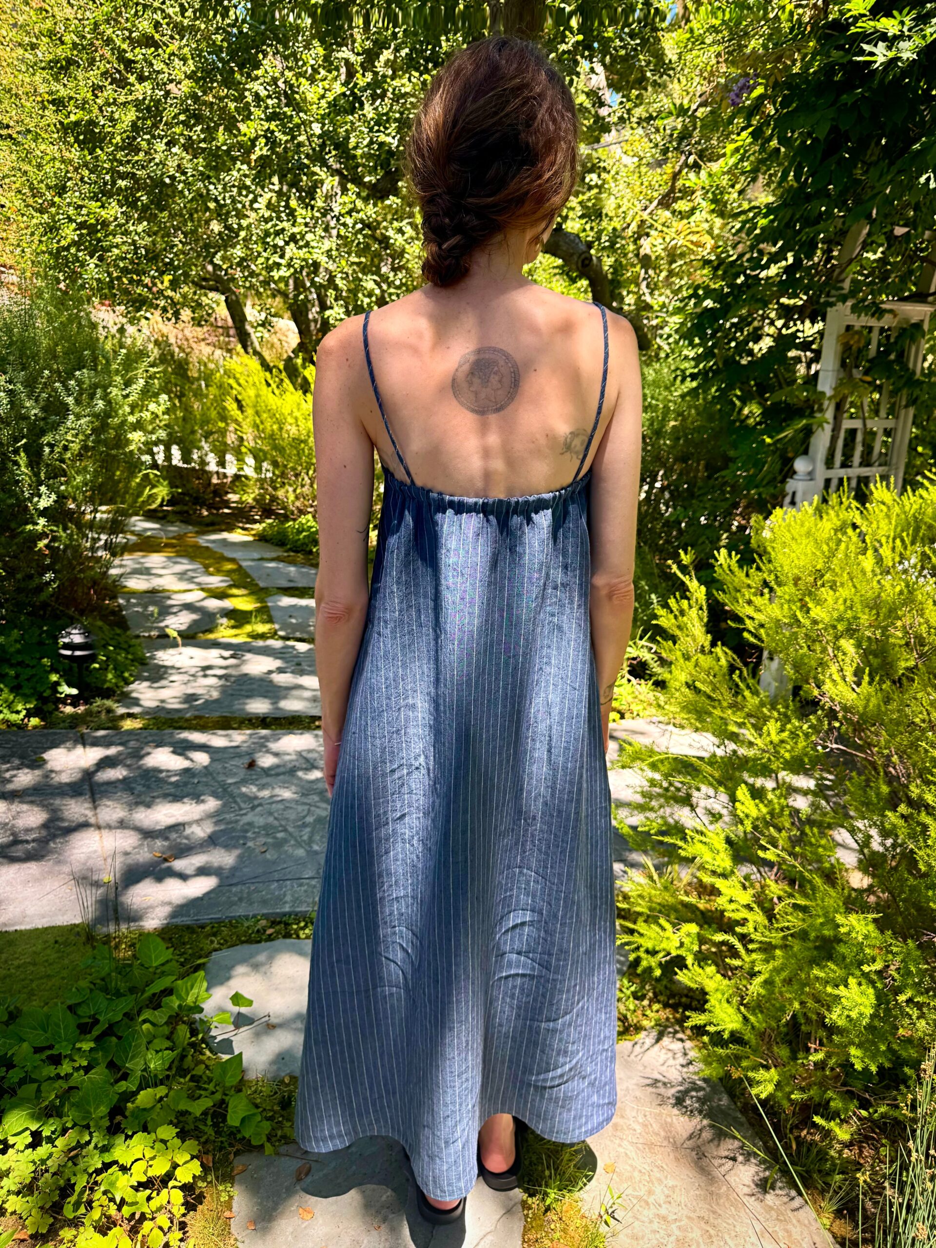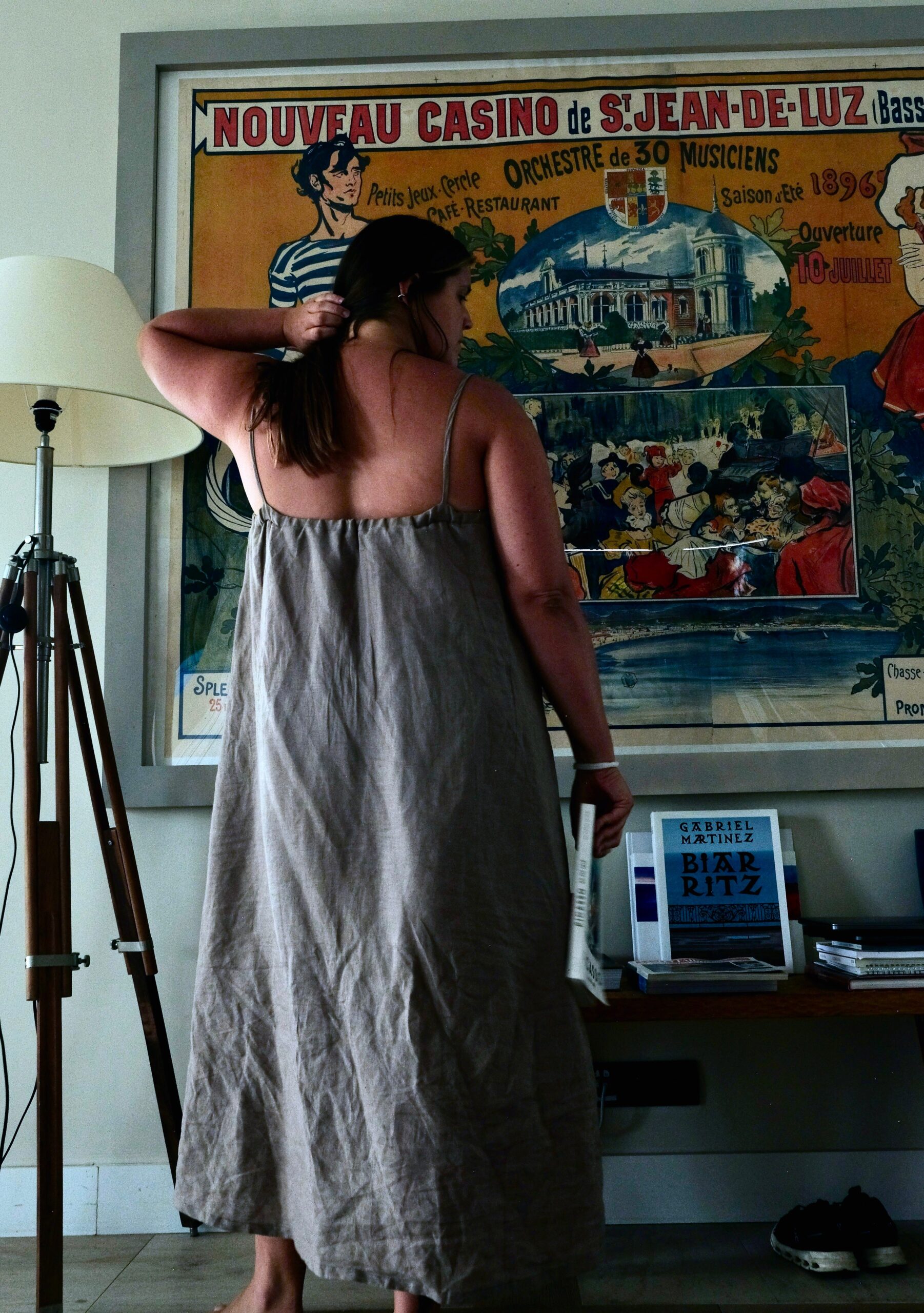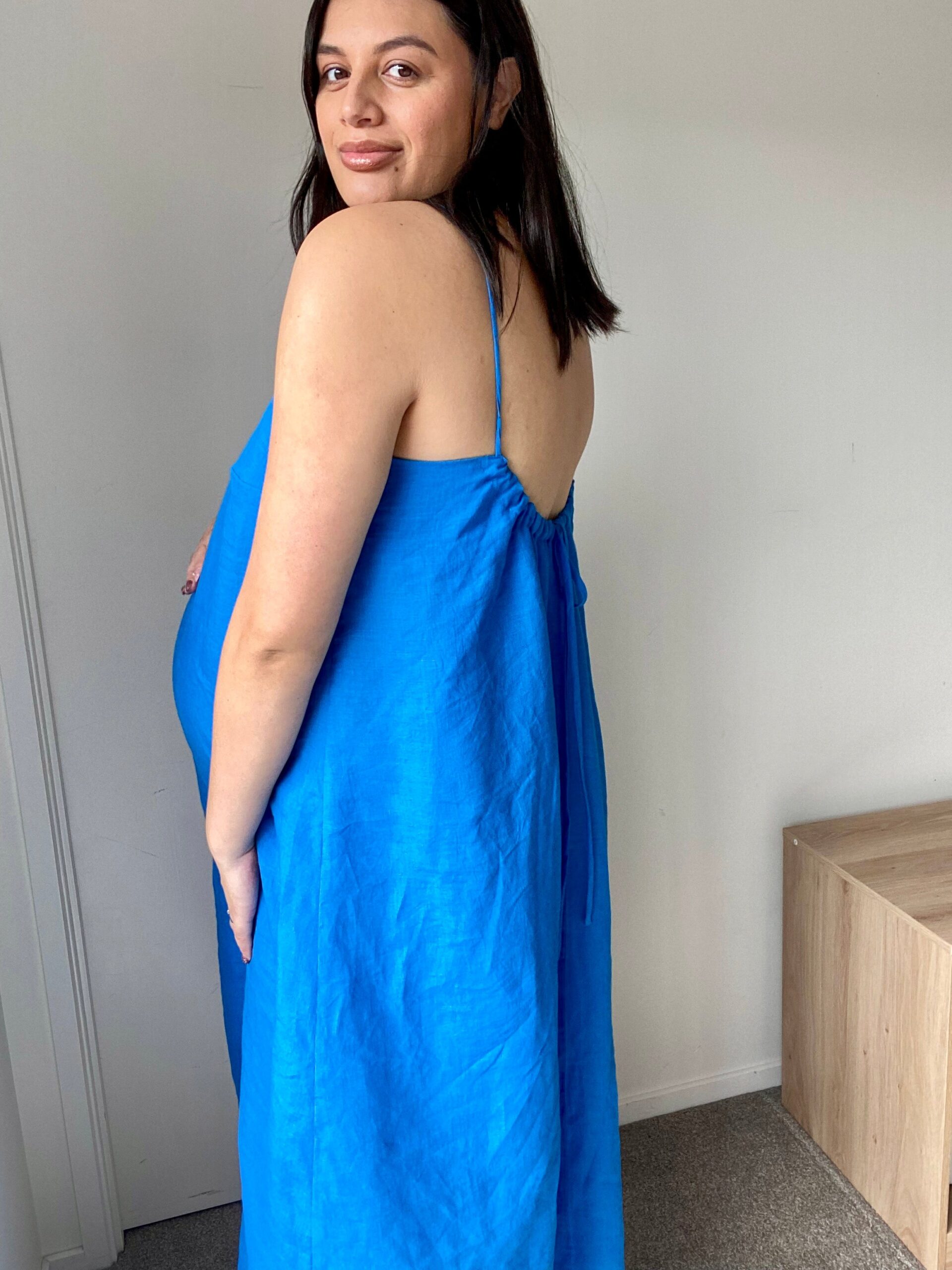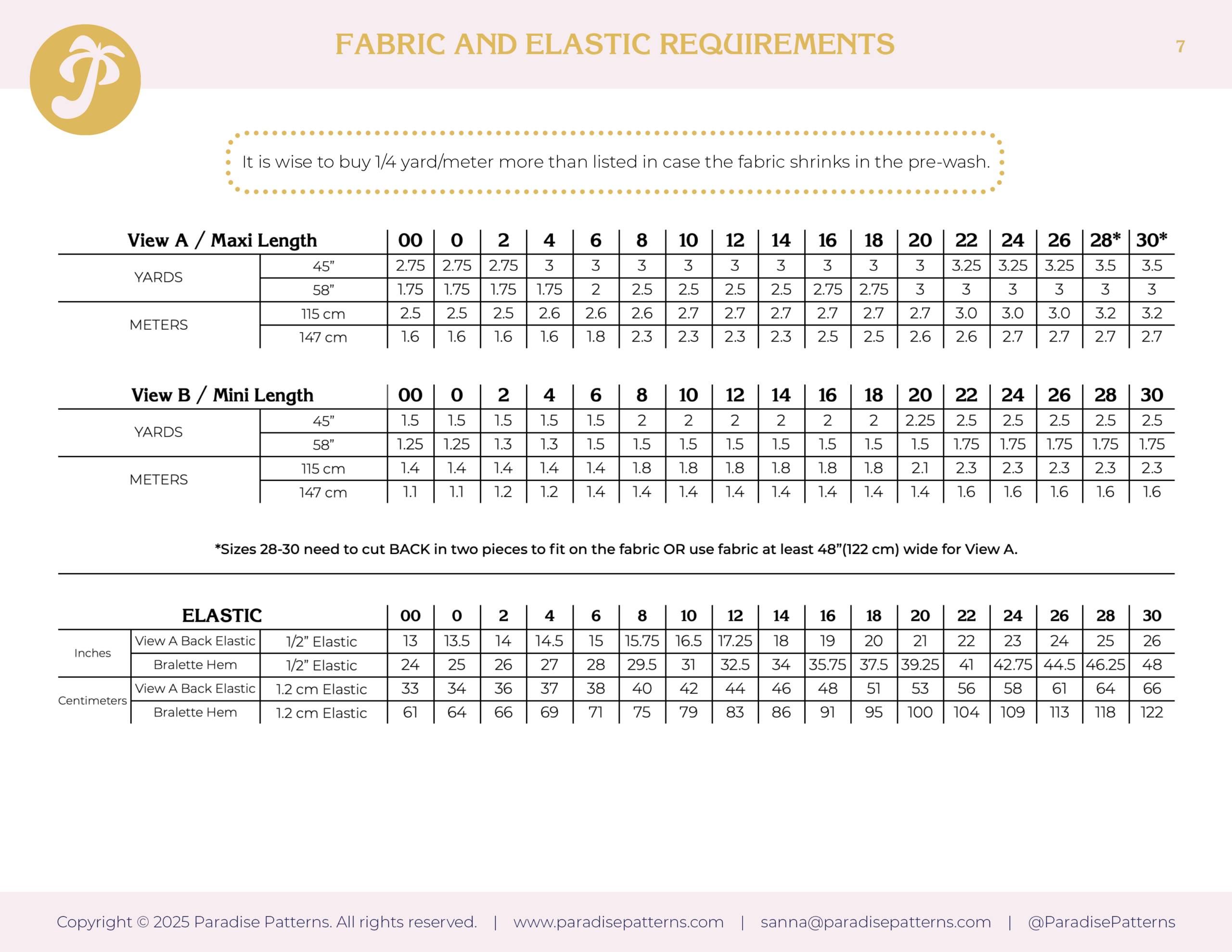This pattern is made for woven fabrics and the look of it will change a lot depending on the fabric you choose. A crepe will make it date night ready, whereas a linen or cotton will make it the perfect everyday summer dress. Other favorites include seersucker for ultimate coolness, cotton poplin for a crisp and billowy silhouette, or any rayon/tencel for a beautiful drape. If choosing a thicker fabric, like linen, you may want to use a matching, lighter weight fabric for the facing/bralette.
