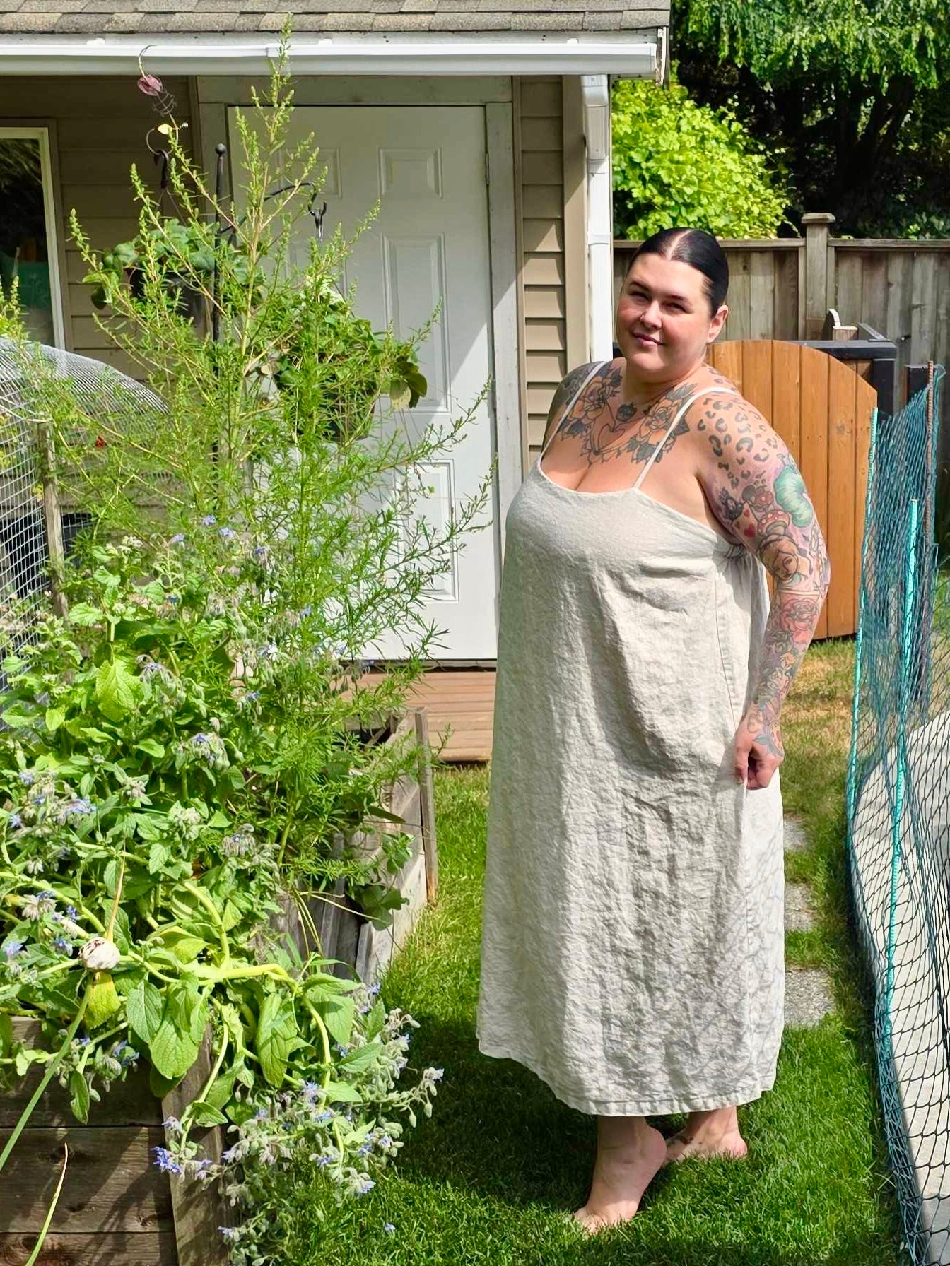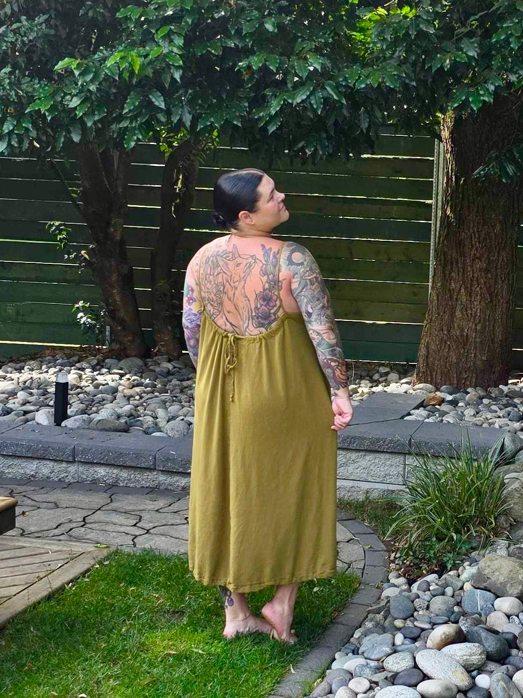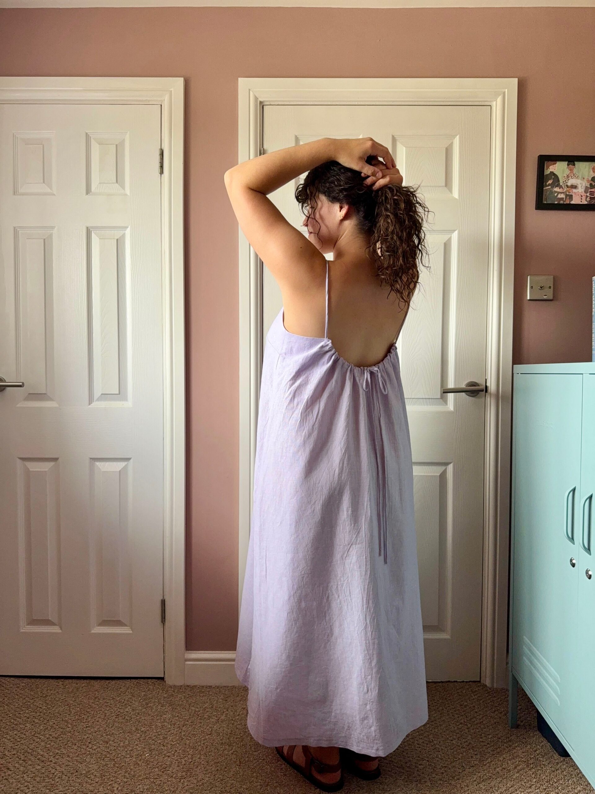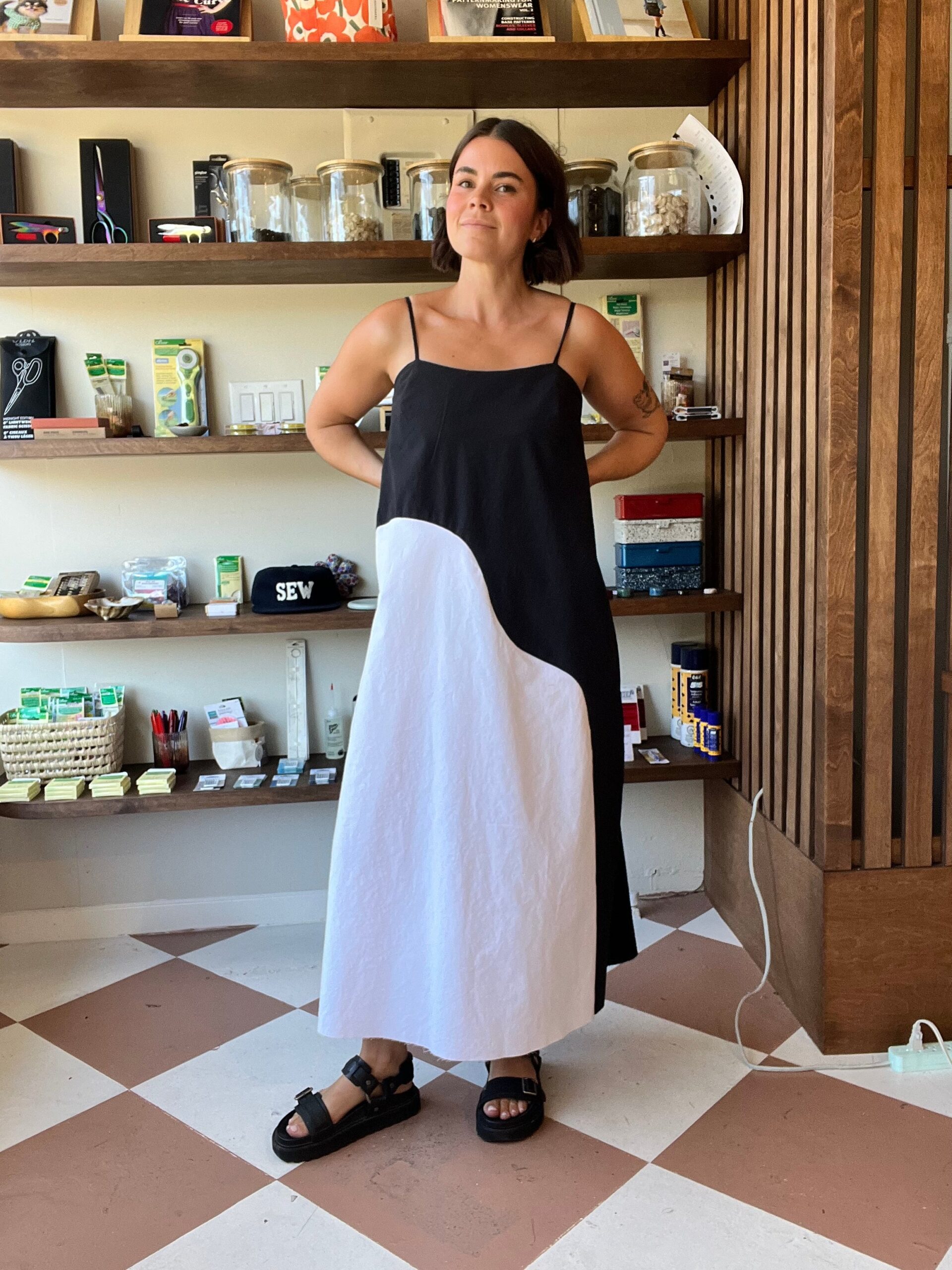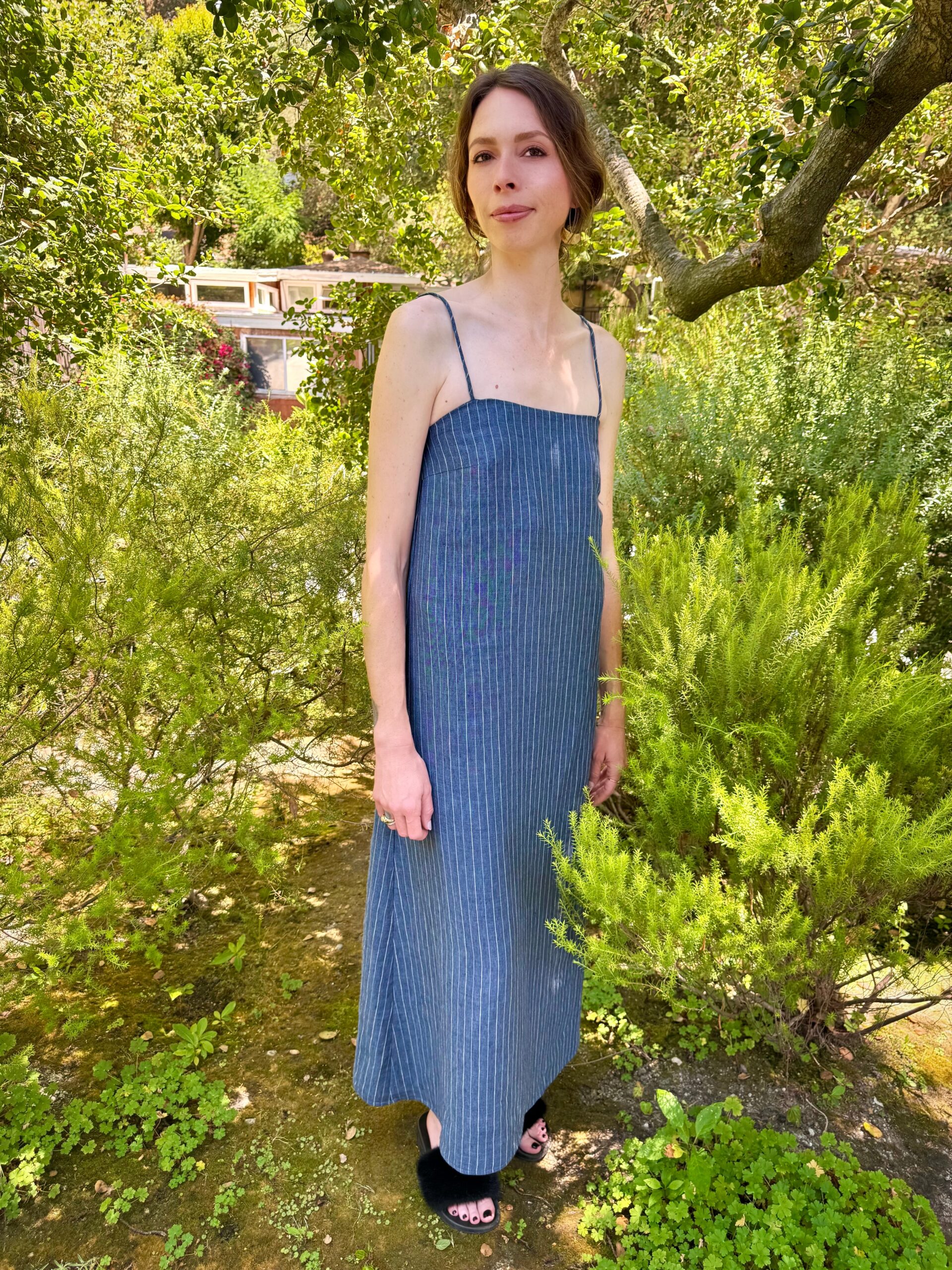 The Solig Dress is a simple dress with a sleek silhouette, suitable for beginners as well as advanced sewists. View A features an elastic back and feels more secure around the bust than View B which has a slightly scooped gathered back with ties. Both views have a gently curved front neckline with side seam bust darts and thin straps. You can choose to make a maxi length version with or without side seam slits, or a mini version. The neckline is finished with a facing that covers your entire bust. The instructions will walk you through installing elastic in the facing hem to make it into a low support built-in-bralette, if you so choose.