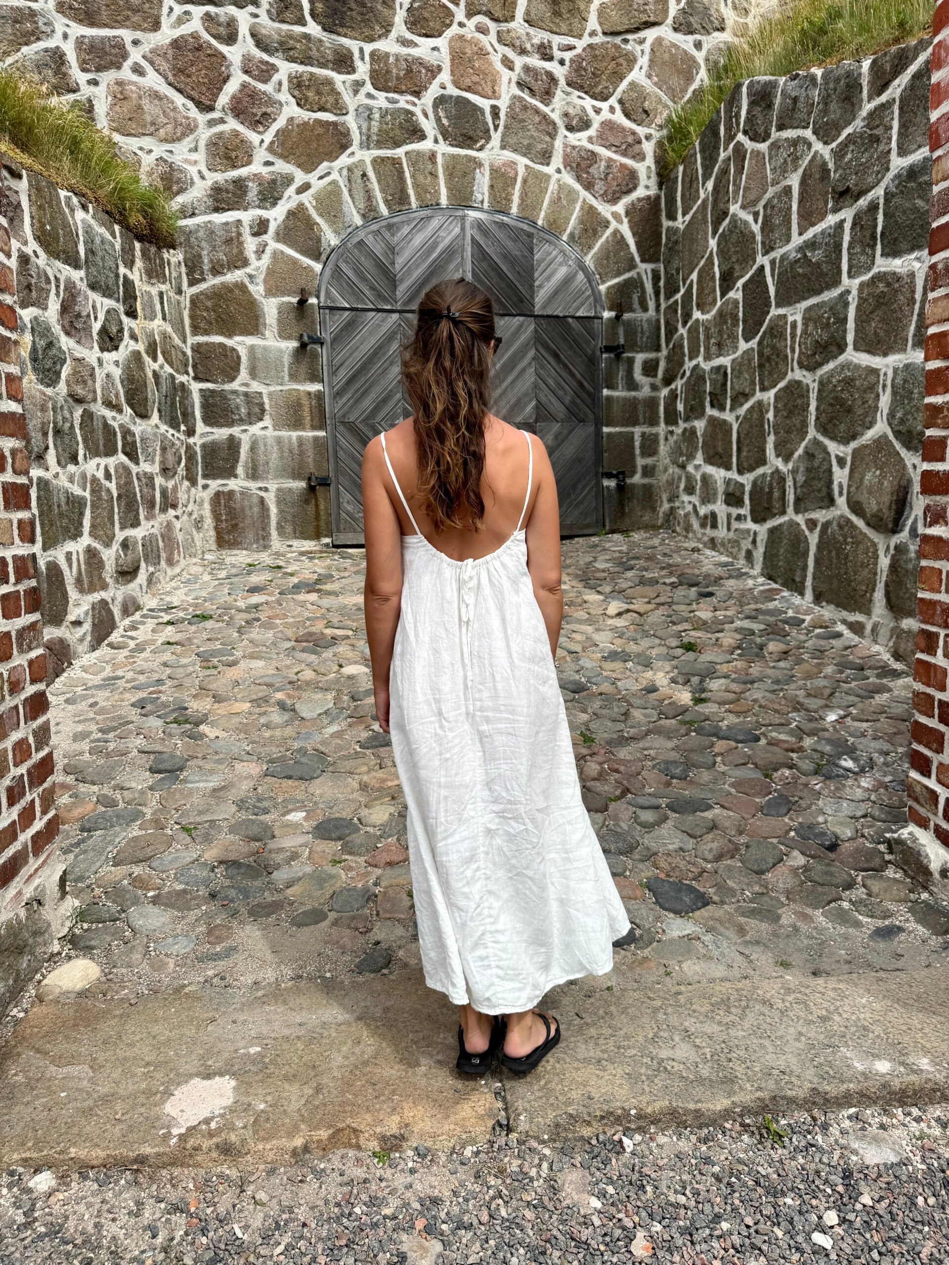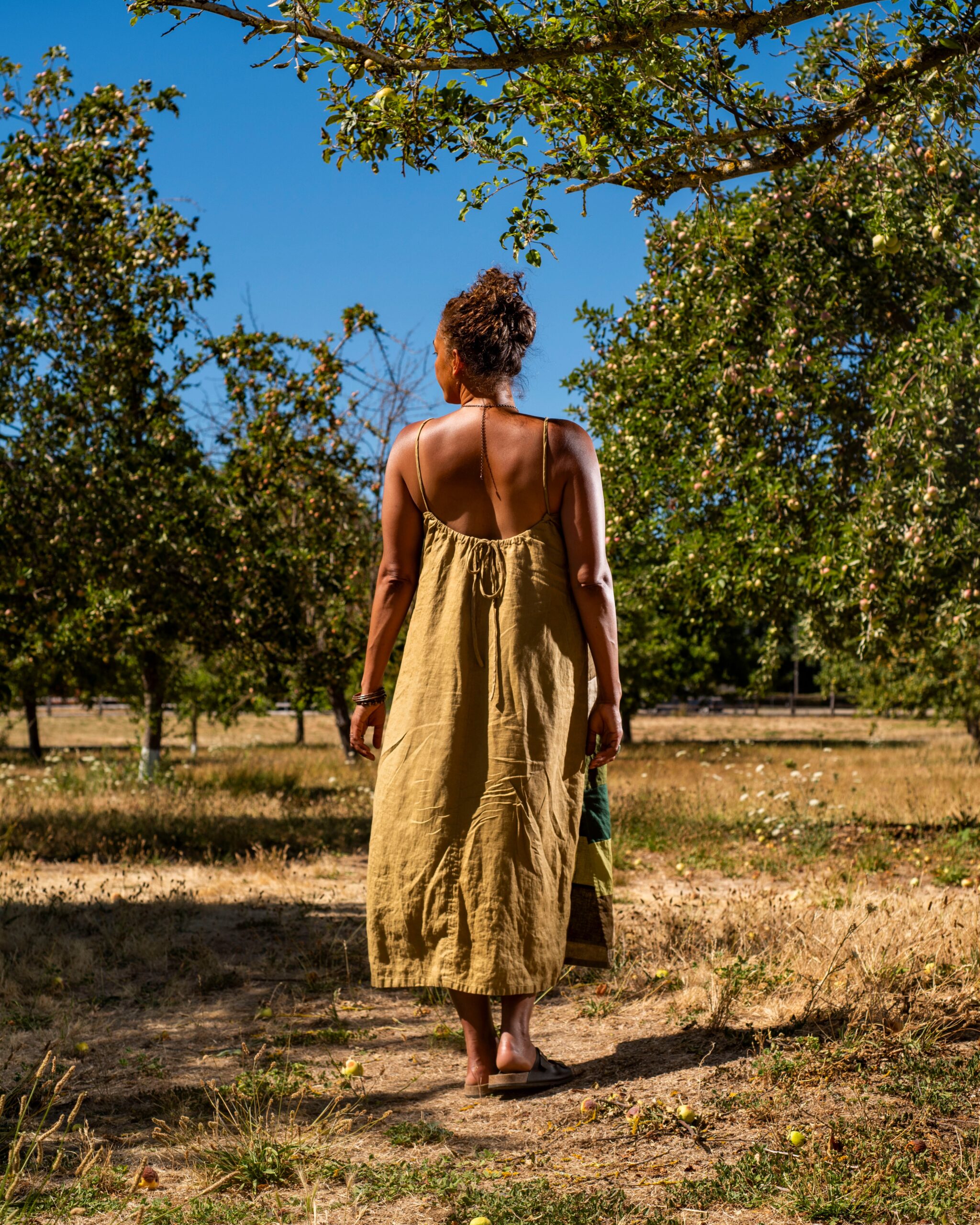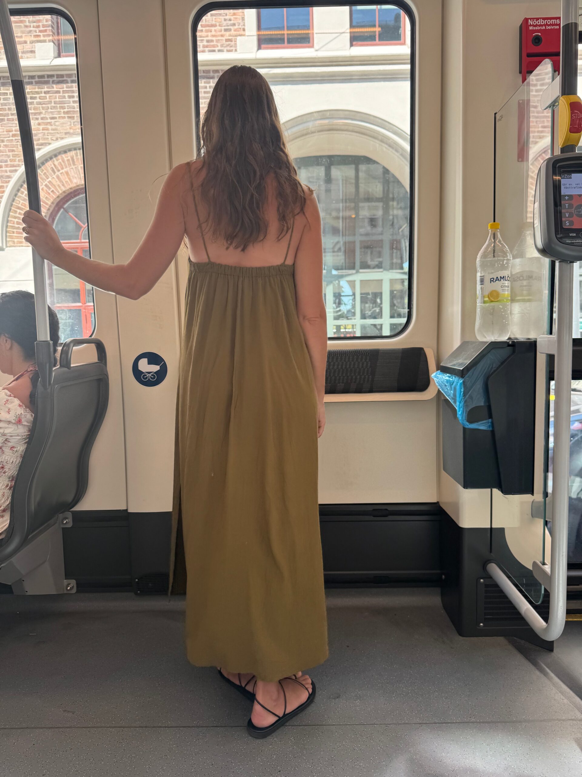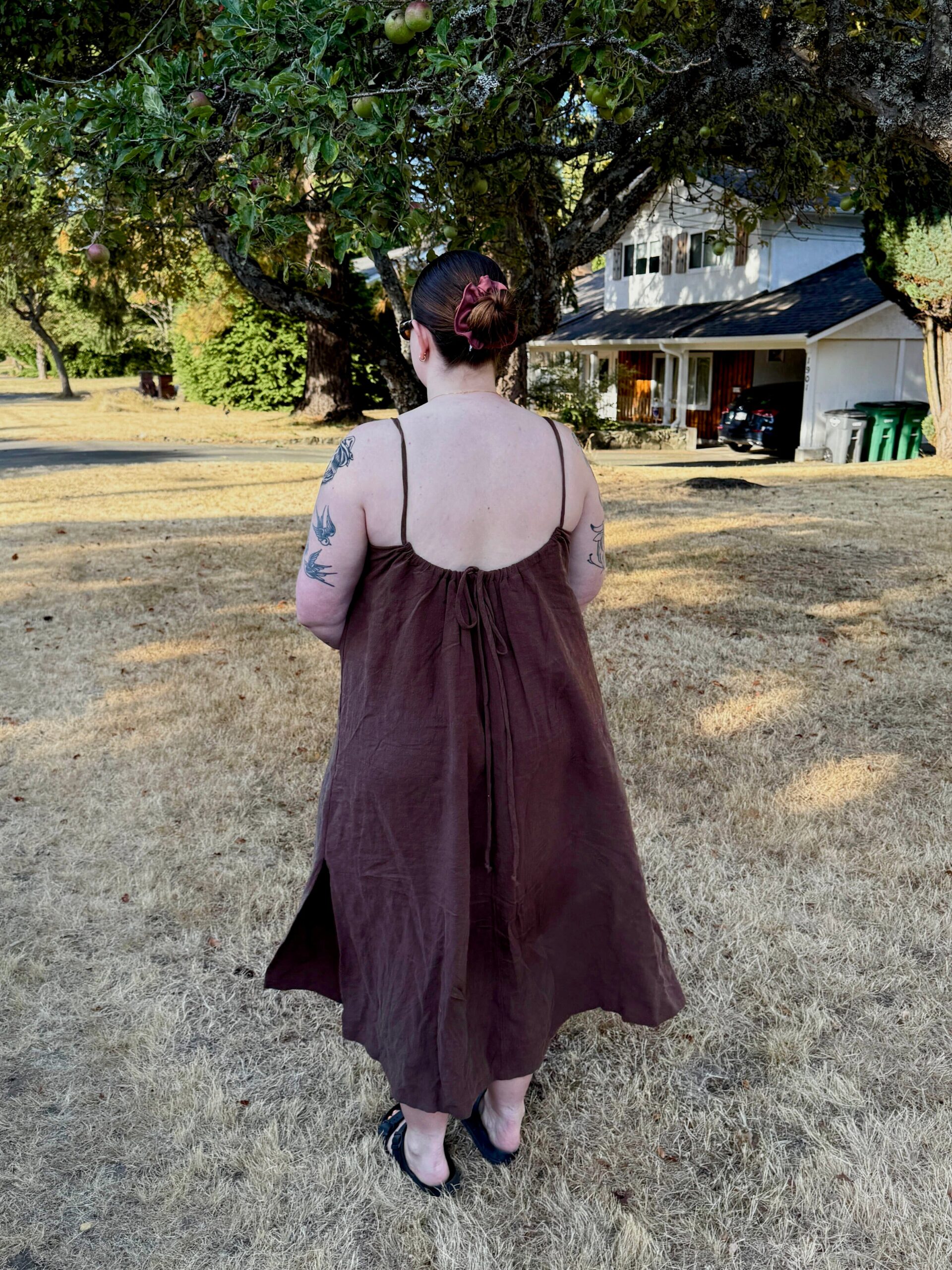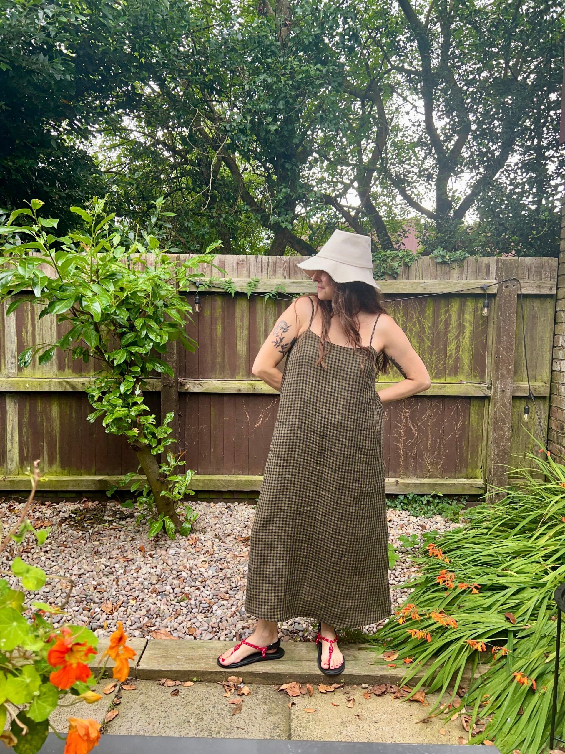 The Solig Dress is a simple dress with a sleek silhouette, suitable for beginners as well as advanced sewists. View A features an elastic back and feels more secure around the bust than View B which has a slightly scooped gathered back with ties. Both views have a gently curved front neckline with side seam bust darts and thin straps. You can choose to make a maxi length version with or without side seam slits, or a mini version. The neckline is finished with a facing that covers your entire bust. The instructions will walk you through installing elastic in the facing hem to make it into a low support built-in-bralette, if you so choose.