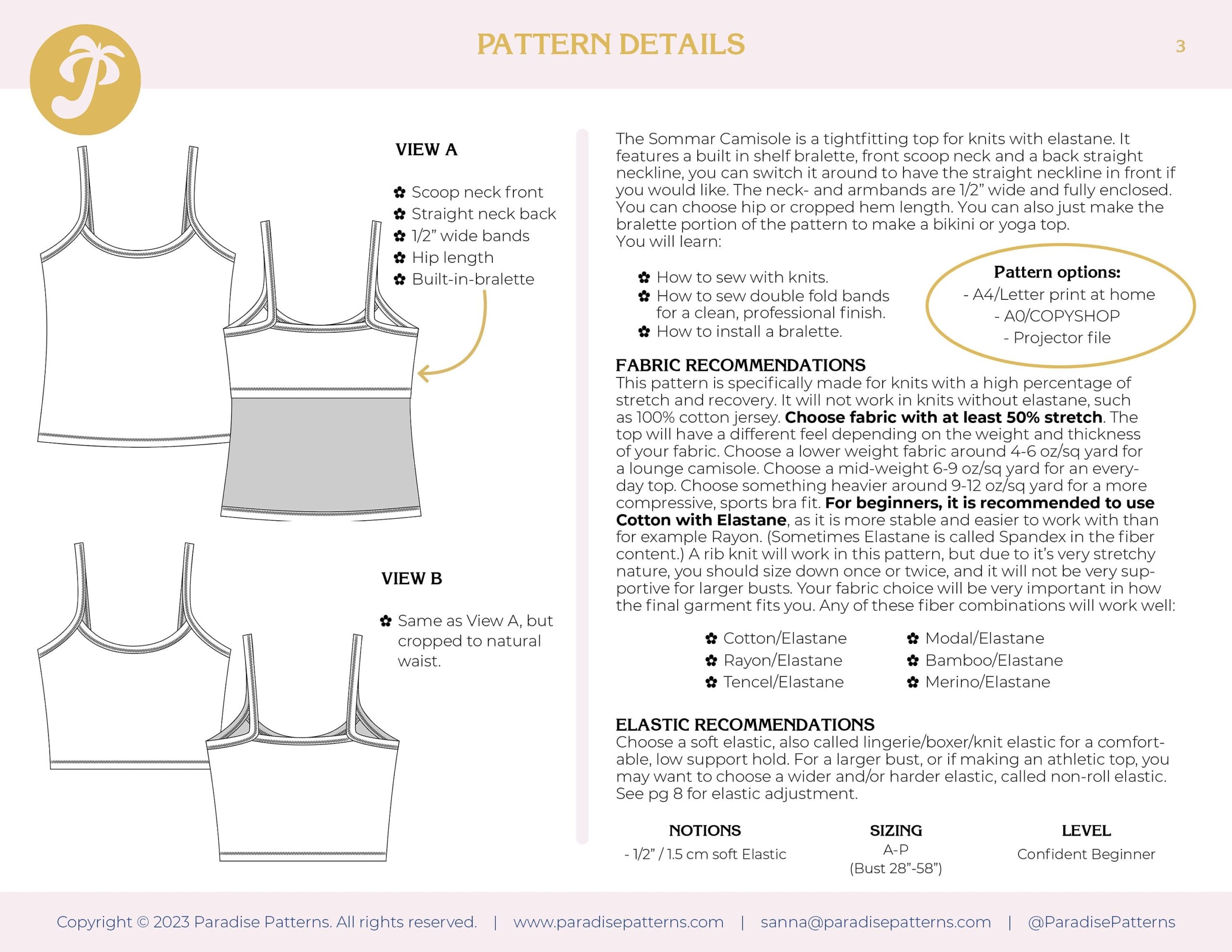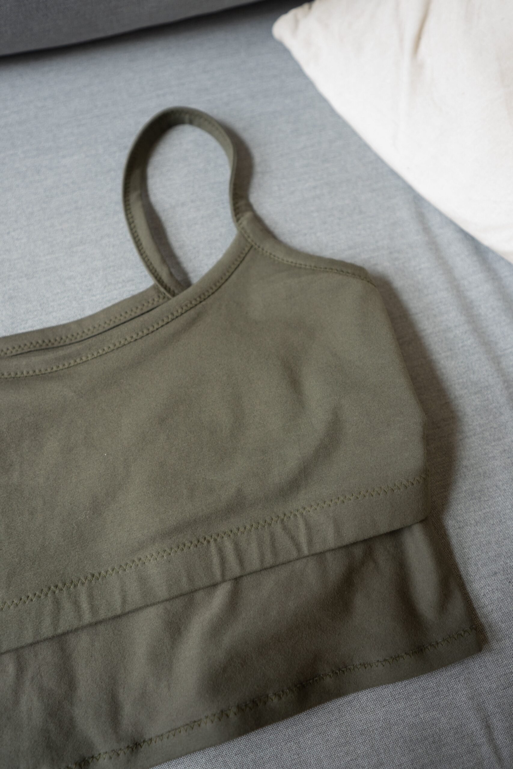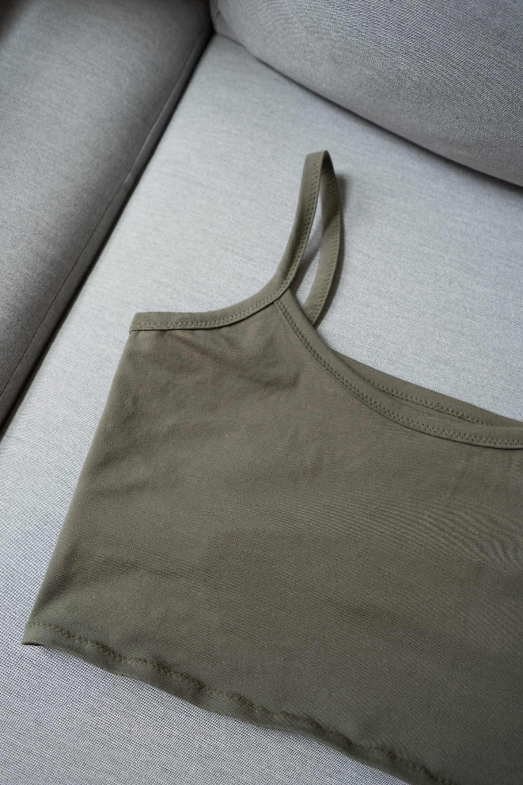 This pattern is specifically made for knits with a high percentage of stretch and recovery. It will not work in knits without elastane, such as 100% cotton jersey. Choose fabric with at least 50% stretch. The top will have a different feel depending on the weight and thickness of your fabric. Choose a lower weight fabric around 4-6 oz/sq yard for a lounge camisole. Choose a mid-weight 6-9 oz/sq yard for an everyday top. Choose something heavier around 9-12 oz/sq yard for a more compressive, sports bra fit. For beginners, it is recommended to use Cotton with Elastane, as it is more stable and easier to work with than for example Rayon. (Sometimes Elastane is called Spandex in the fiber content.) A rib knit will work in this pattern, but due to itโs very stretchy nature, you should size down once or twice, and it will not be very supportive for larger busts. Your fabric choice will be very important in how the final garment fits you. Any of these fiber combinations will work well: