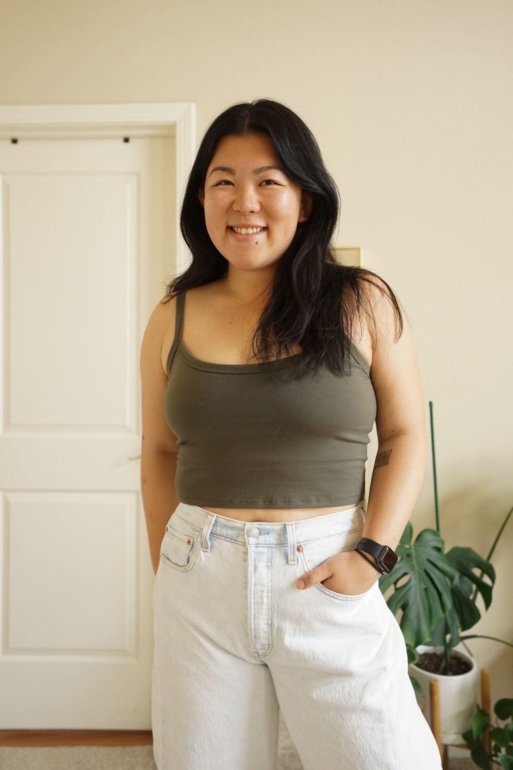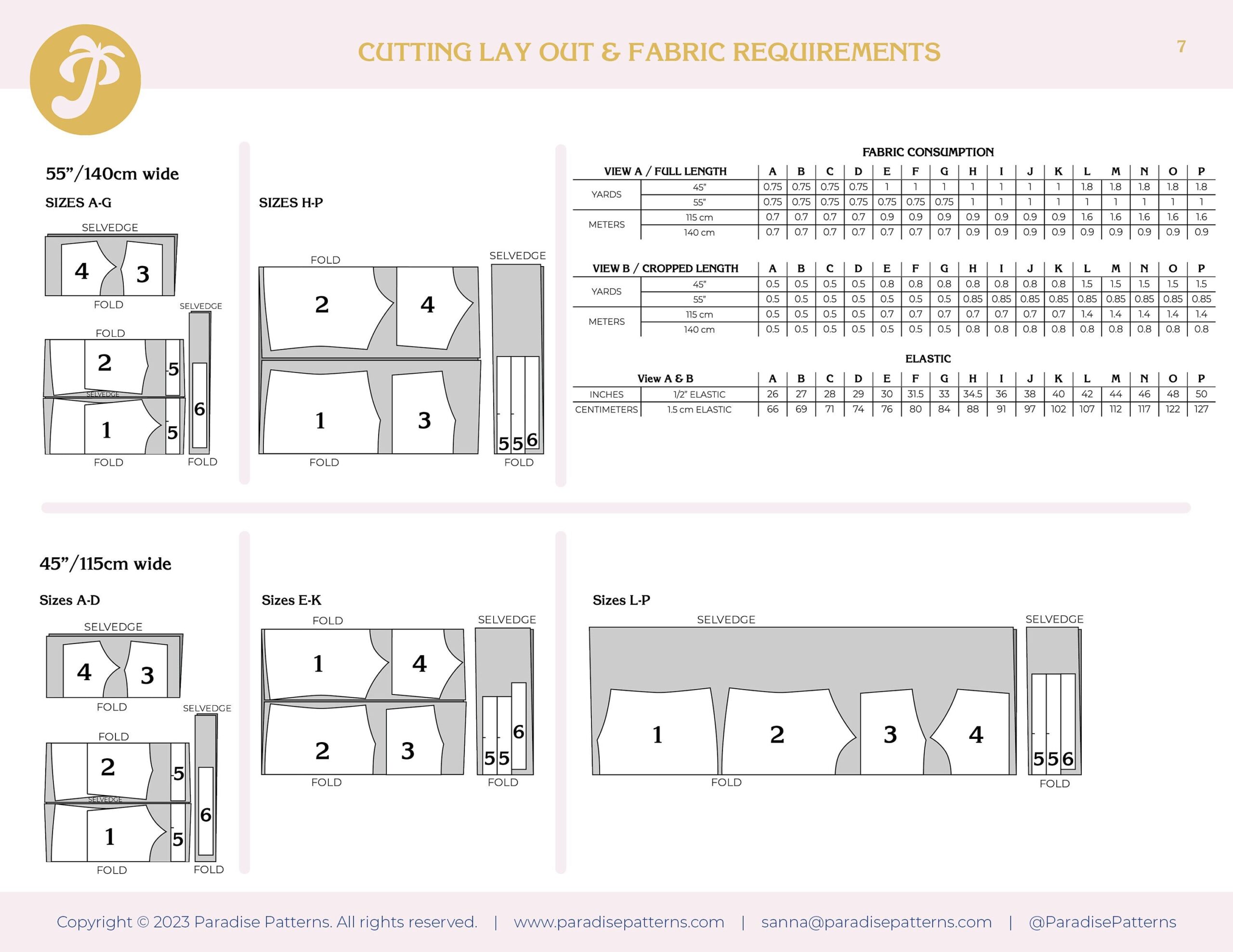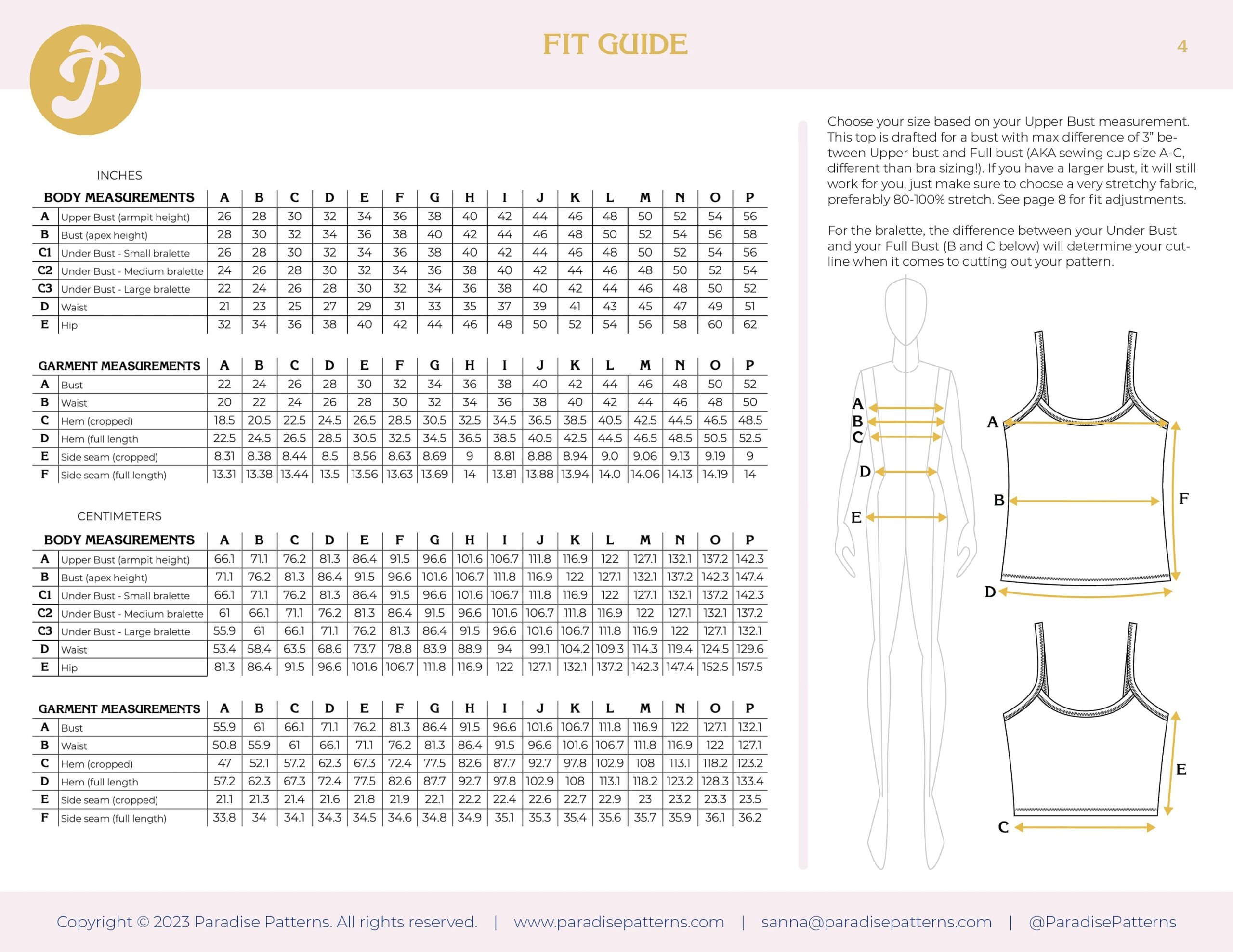 This pattern is specifically made for knits with a high percentage of stretch and recovery. It will not work in knits without elastane, such as 100% cotton jersey. Choose fabric with at least 50% stretch. The top will have a different feel depending on the weight and thickness of your fabric. Choose a lower weight fabric around 4-6 oz/sq yard for a lounge camisole. Choose a mid-weight 6-9 oz/sq yard for an everyday top. Choose something heavier around 9-12 oz/sq yard for a more compressive, sports bra fit. For beginners, it is recommended to use Cotton with Elastane, as it is more stable and easier to work with than for example Rayon. (Sometimes Elastane is called Spandex in the fiber content.) A rib knit will work in this pattern, but due to itโs very stretchy nature, you should size down once or twice, and it will not be very supportive for larger busts. Your fabric choice will be very important in how the final garment fits you. Any of these fiber combinations will work well: