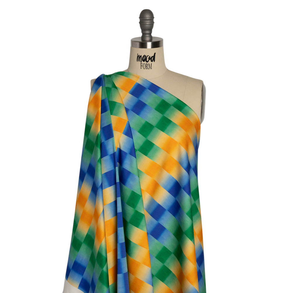 Stretch Cotton Sateen – Orange and Blue Gradient Checkered Stripes – Checks Out Print – Mood Exclusive Marigold Collection