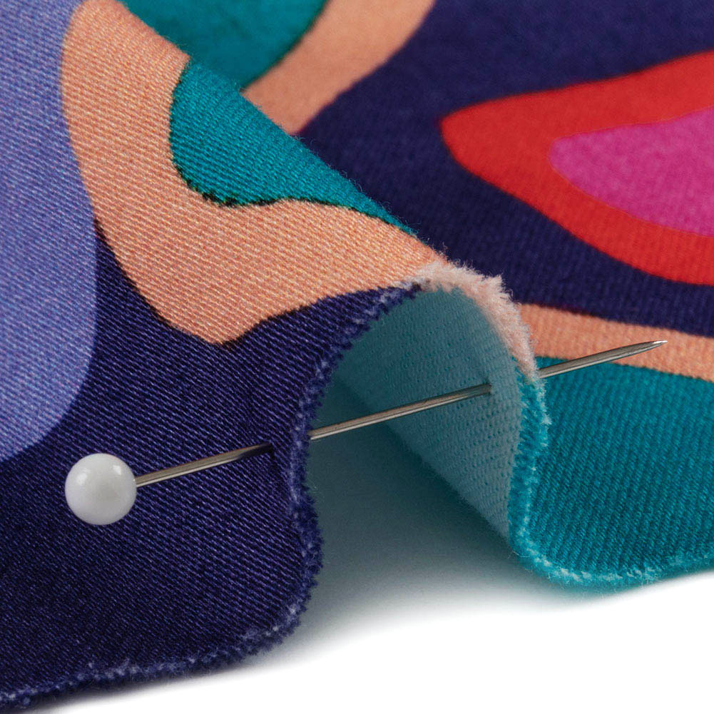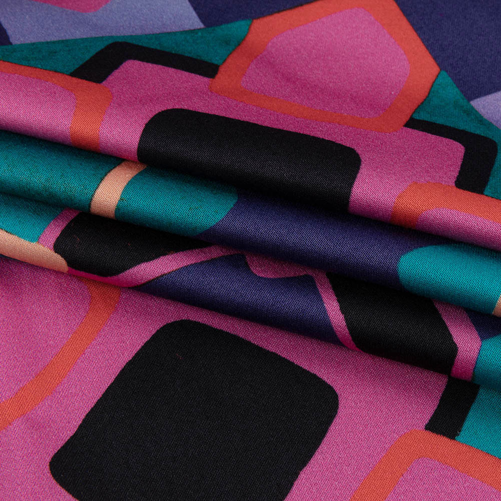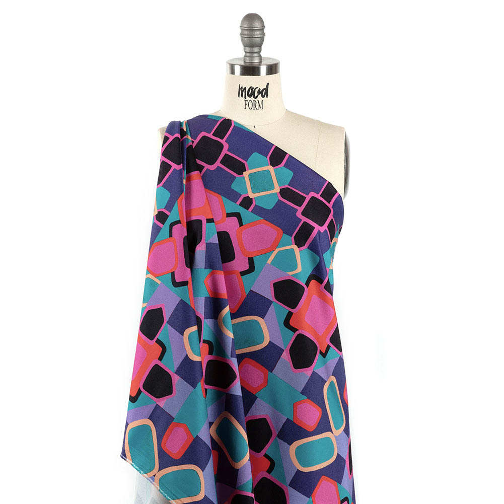 Drop a dime in the jukebox and start dancing—this Mood Exclusive Blue Jukebox Jivin' Stretch Cotton Sateen is as infectious as the music. A bold arrangement of squares, diamonds, and rectangles tile the face in shades of pink, blue, purple, and black. These cotton sateen fabrics, in addition to displaying a smooth, luminous surface, feature a semi-structured drape and a 10% weftwise stretch. Invite retro looks into structured shirt-dresses, wide-legged trousers, bomber jackets, and more! Opaque, a lining may only be necessary if added structure is desired. Inspired by the sights and sounds of the 60s and 70s, The Yesterday Collection delivers bold colors, abstract shapes, and an air of excitement.