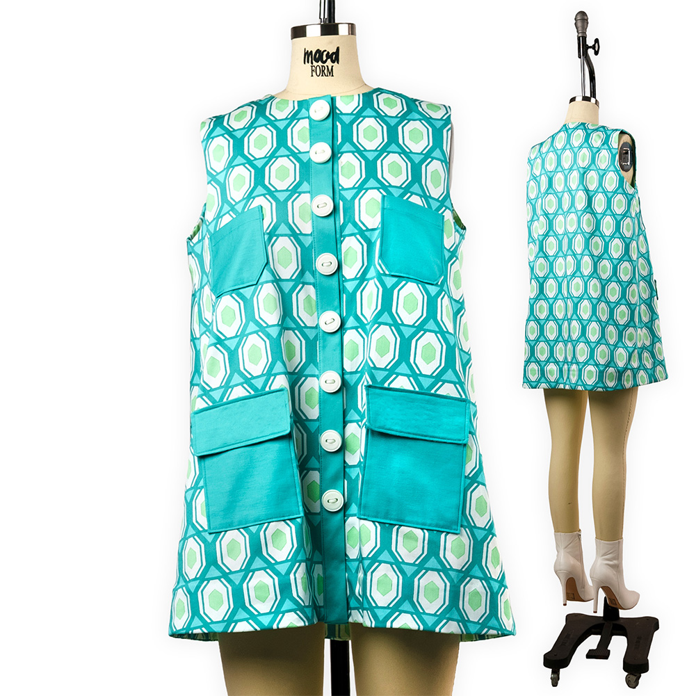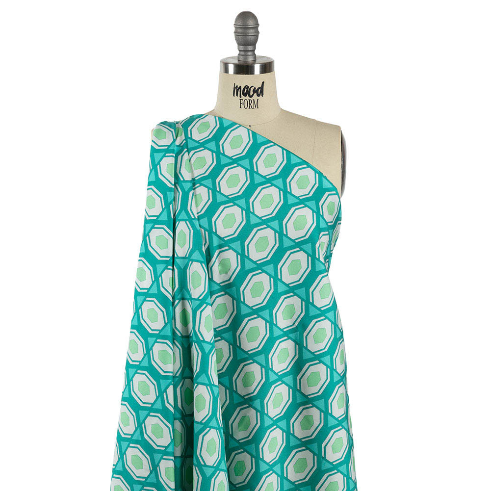 Whether you choose to spend your weekend nights at the drive-in movies or the disco, our Mood Exclusive Turquoise Arcade Fever Stretch Cotton Sateen is happy to accompany you everywhere. Rows of turquoise, white, and pale green hexagons line the face like a cool-toned beehive. These cotton sateen fabrics, in addition to displaying a smooth, luminous surface, feature a semi-structured drape and a 10% weftwise stretch. Invite retro looks into structured shirt-dresses, wide-legged trousers, bomber jackets, and more! Opaque, a lining may only be necessary if added structure is desired. Inspired by the sights and sounds of the 60s and 70s, The Yesterday Collection delivers bold colors, abstract shapes, and an air of excitement.