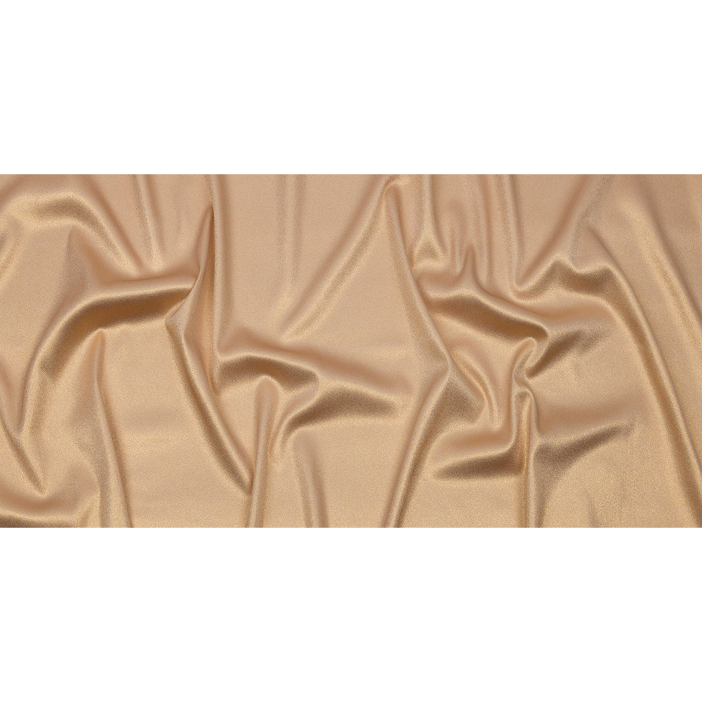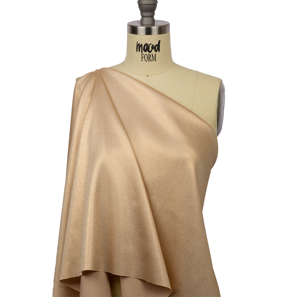 Simple meets spectacular in this Devyn Beige and Gold Foiled Stretch Polyester Crepe. This beige delight, with an abundance of shine thanks to gold foiling across the face, features a grainy texture and 25% weftwise stretch. With a malleable and voluminous drape, try timeless blazers, versatile dresses, or circle skirts. Opaque, a lining is not necessary for most projects.