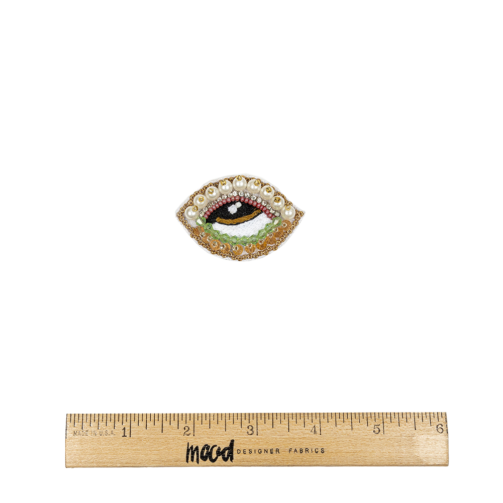 Elevate your next project with this Summer Green, Kumquat and White Pearl Eye Beaded and Embroidered Appliqué! Measuring 1.375 inches by 2.25 inches overall, this appliqué takes the shape of a single eye, composed of an embroidered cornea and iris, surrounded by lashes of soft orange, light green, pink, gold, and pearl glass beads.Individually hand-beaded, these appliqués are truly one-of-a-kind, perfect for adding a couture touch to every garment you make. Dress up a denim jacket or a hat, decorate the lapels of a shirt or blazer, or apply a glittering accent to gowns and special occasion dresses—every appliqué provides a glistening multitude of possibilities.Please Note: These couture appliqués arrive in a sealed package adhered to a paper backing card; when removing, it is possible that a bead of glue may remain on the reverse. The glue is best removed with an X-Acto or utility knife. Keeping the blade parallel to the back of the appliqué, simply cut the adhesive bead off; if any residual glue or paper remains, lightly scrape the blade back and forth over the area. A fresh blade is recommended. Always point the blade away from your body and hands while cutting or scraping.