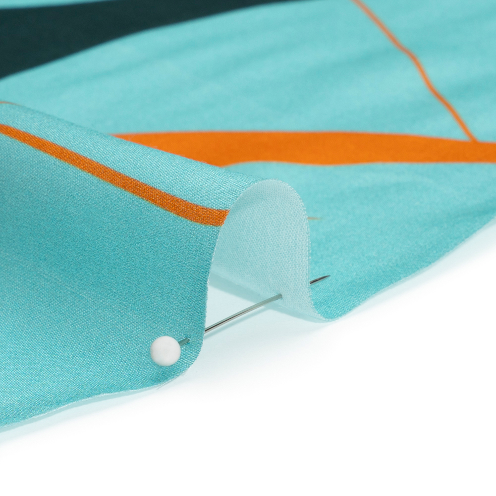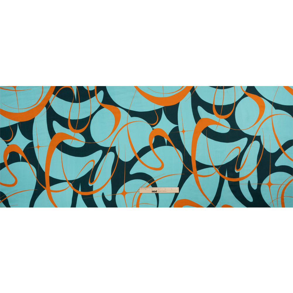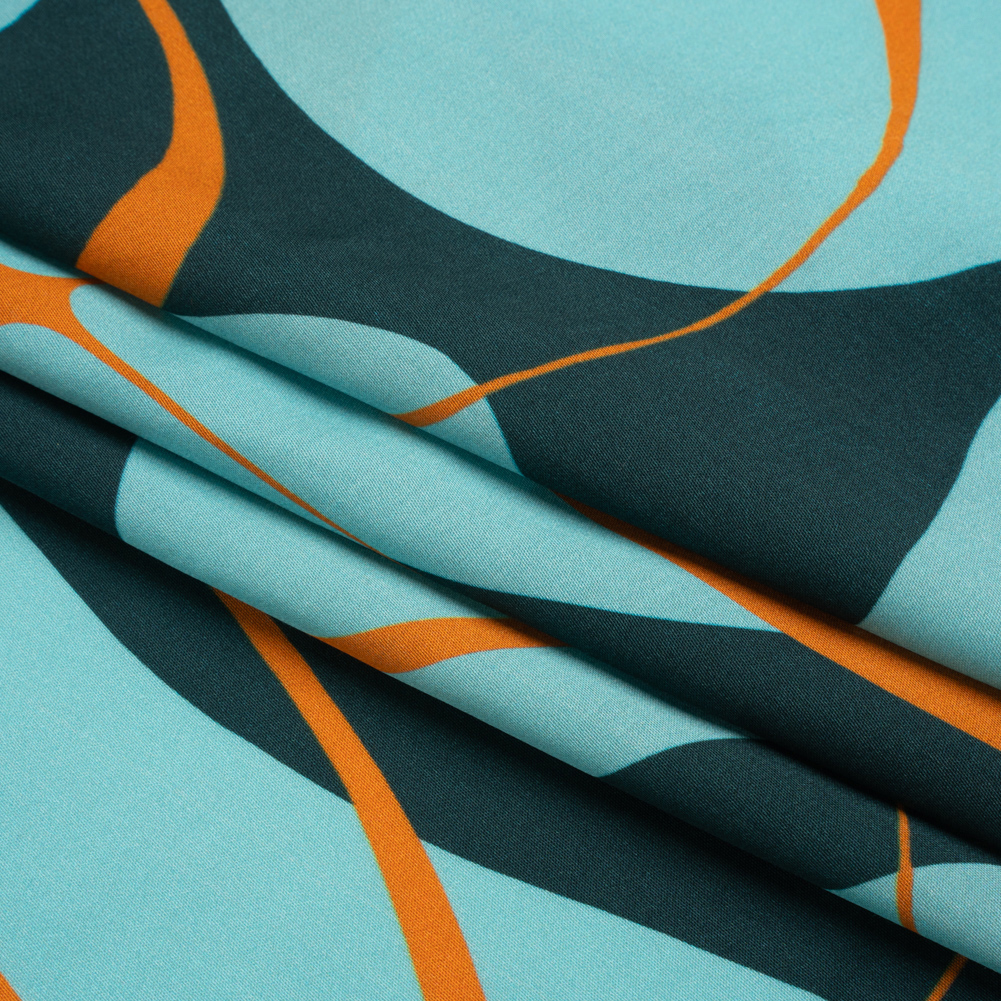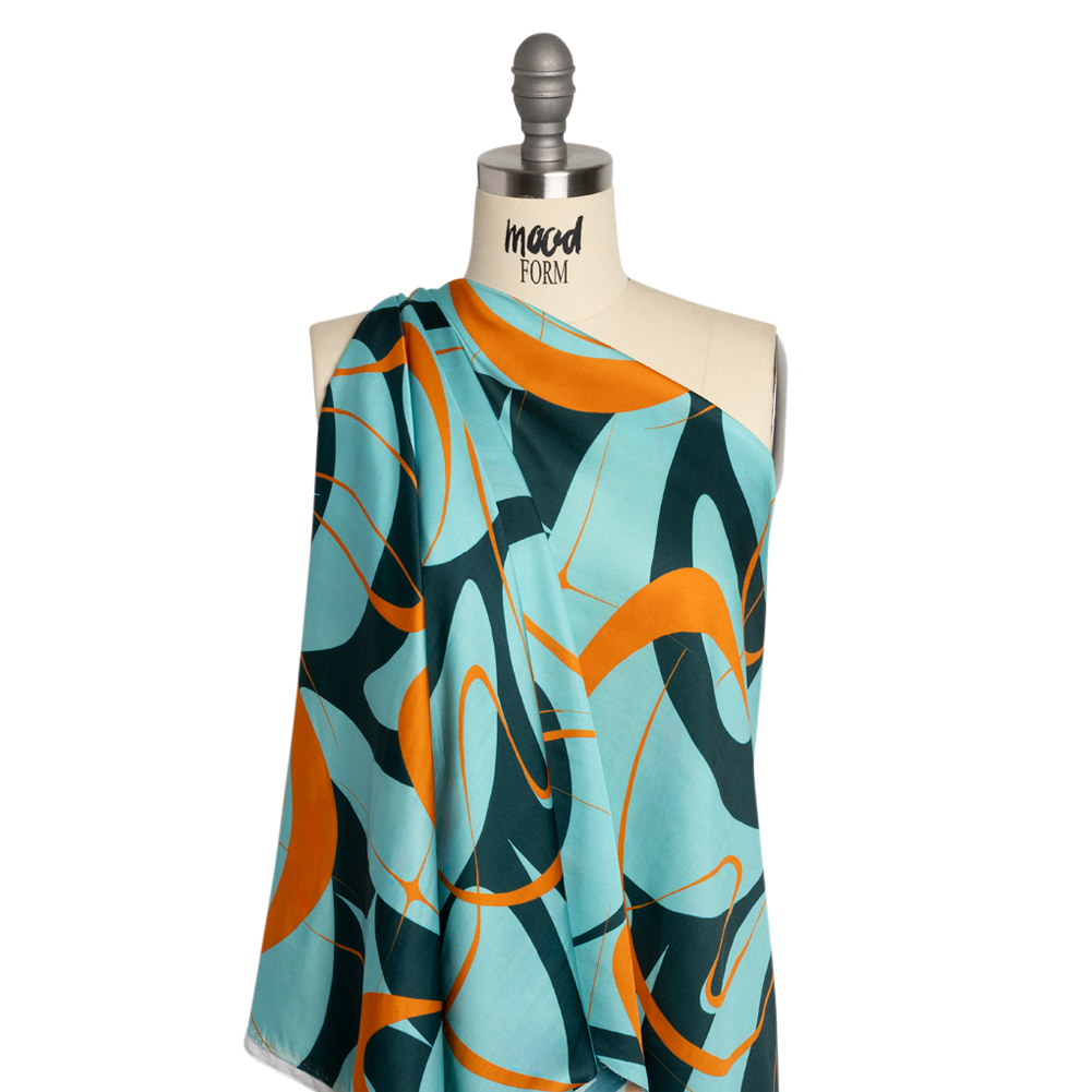 Sustainable and Recycled Viscose Satin Print - Turquoise and Orange Swirling Abstract - Mood Exclusive Atmospheric Adventure