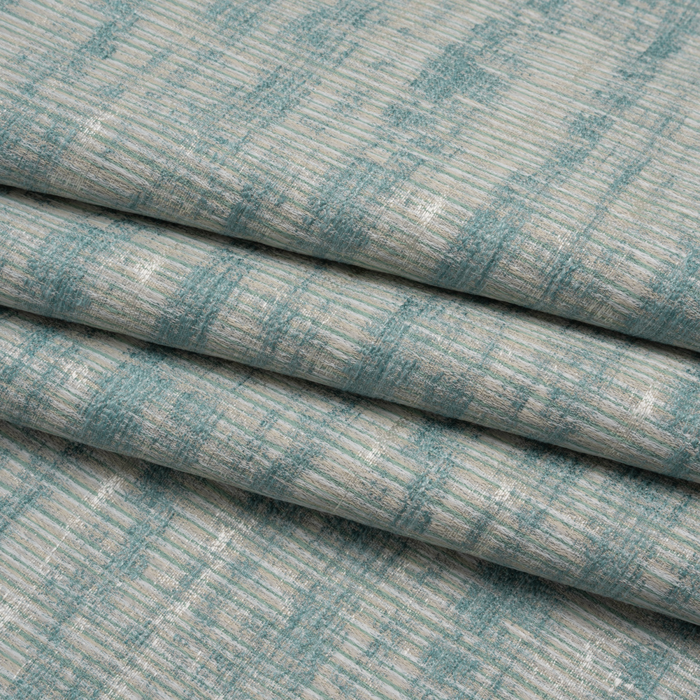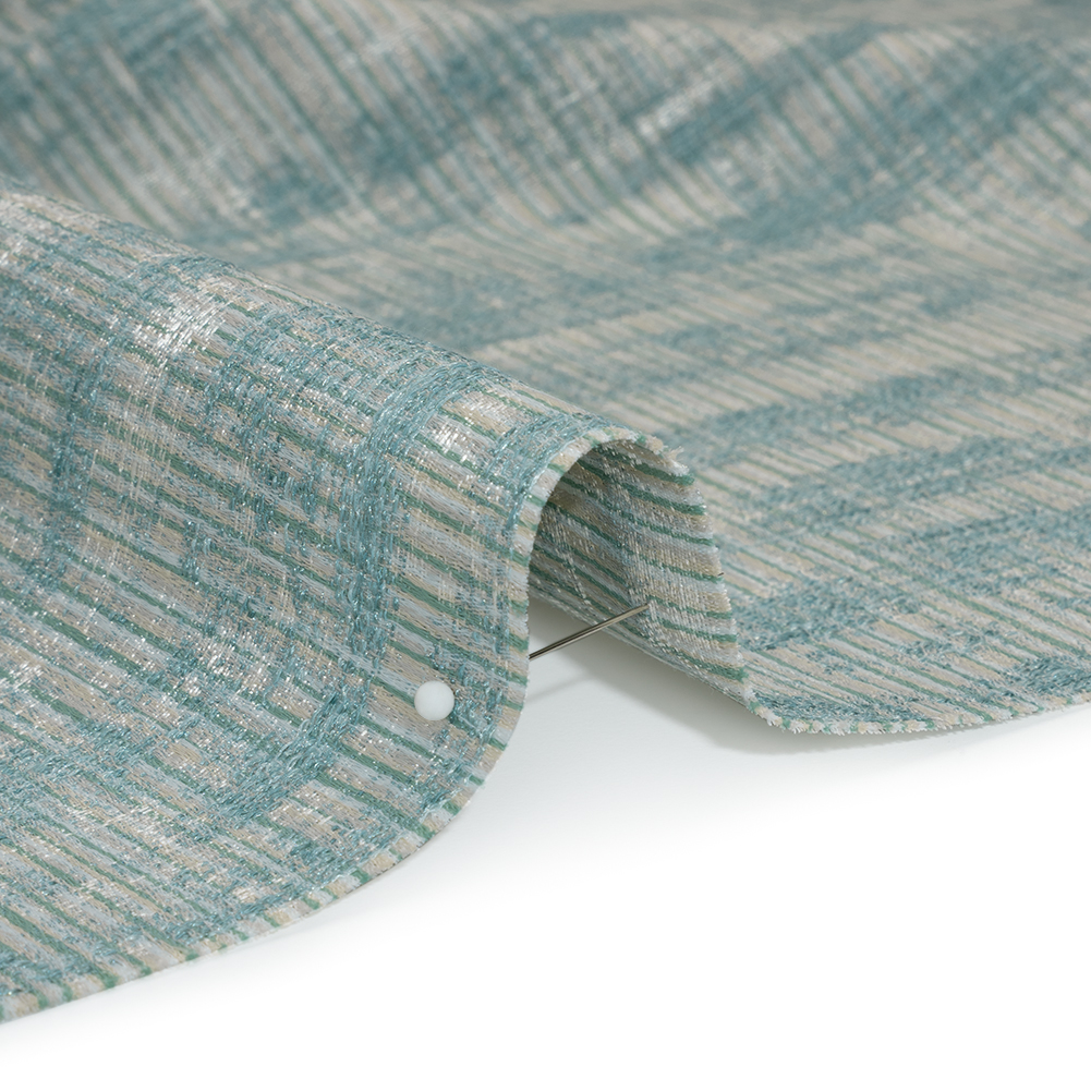Spend the day inside with you and your o-pals lounging atop this Opal Abstract Textured Drapery Jacquard. Composed of recycled polyester and with a tactile hand and fluid drape, it’s a truly luxurious way to introduce texture to your interior.Suggested Projects: Curtains, Valances, Throw Pillows, HeadboardsContent: 72% Recycled Polyester, 28% PolyesterStretch: NoneOpacity: OpaqueA lightly striped beige and muted turquoise face is crossed perpendicularly with abstract muted turquoise threads—their weave resulting in a lustrous, tactile hand. With a fluid drape and opaque in construction, this drapery jacquard is ideal for curtains and valances, or light upholstery like throw pillows, cushions, and truly luxurious upholstered headboards. Opaque, a lining may be considered for structure or to achieve a full blackout effect.