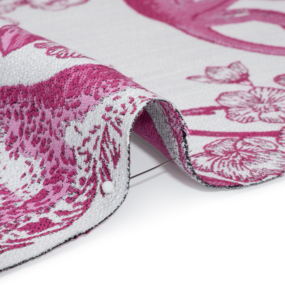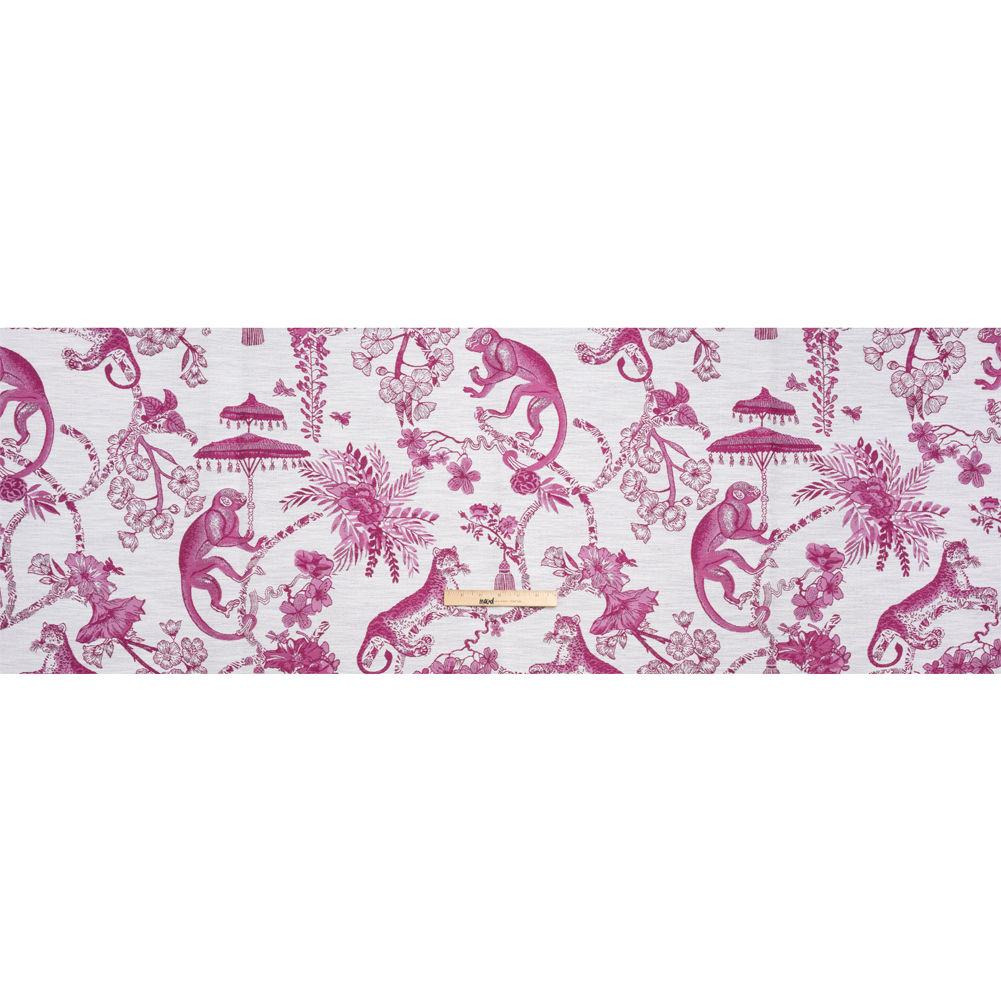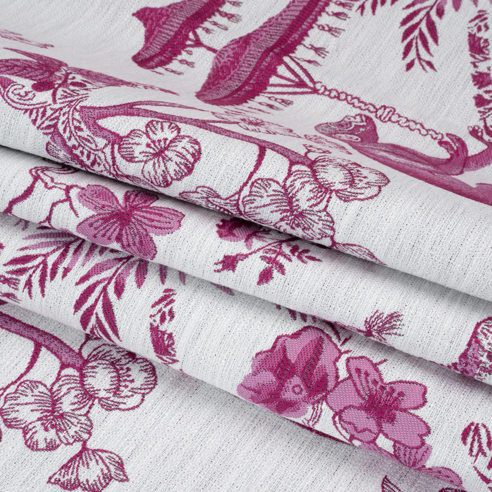 This Tourmaline Exotic Pets and Flowers Upholstery Jacquard declares elegance through your home! The unbothered sultan and his busy advisor let us into their royal society of branches, bees, and blossoms, colored fuchsia and light pink under a white sky. A Jacquard loom is to thank for the embroidered-like texture, complimenting the air of sophistication already established by the pattern. It features a sleek yet pebbly hand and a malleable drape. A slight luster is the final touch of luxury, solidifying this fabric's place in formal dining rooms, elevated living rooms, and mature bedrooms—we imagine ornate couches, reupholstered vintage chaises, bar stool covers, and more.
