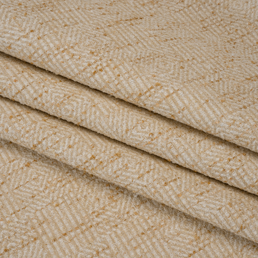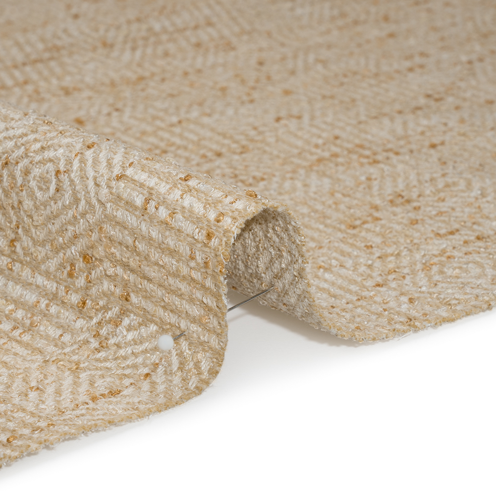 Oat-standing interiors begin with this Oat Diamond and Stripe Checks Tweedy Boucle Upholstery Jacquard. With a soft, tactile hand and malleable drape, use it to check your next home project off your list.Suggested Projects: Armchairs, Sofas, Ottomans, SectionalsContent: 72% Polyester, 28% CottonStretch: NoneOpacity: Mostly OpaqueTweed knew you’d love this upholstery jacquard! In classic jacquard style, the face features oat beige and golden yellow alternating diamond and stripe checks—lined with white threads—and the back dons the inverse. The iconic texture is a midday-nap-instigator and compliment-creator, igniting conversations regarding its lustrous finish and welcoming cozy gatherings on its soft, tactile face. Heavy and featuring a malleable drape, this fabric is ideal for both large and small upholstery projects, ranging from throw pillows and ottomans to sectionals and chaises.