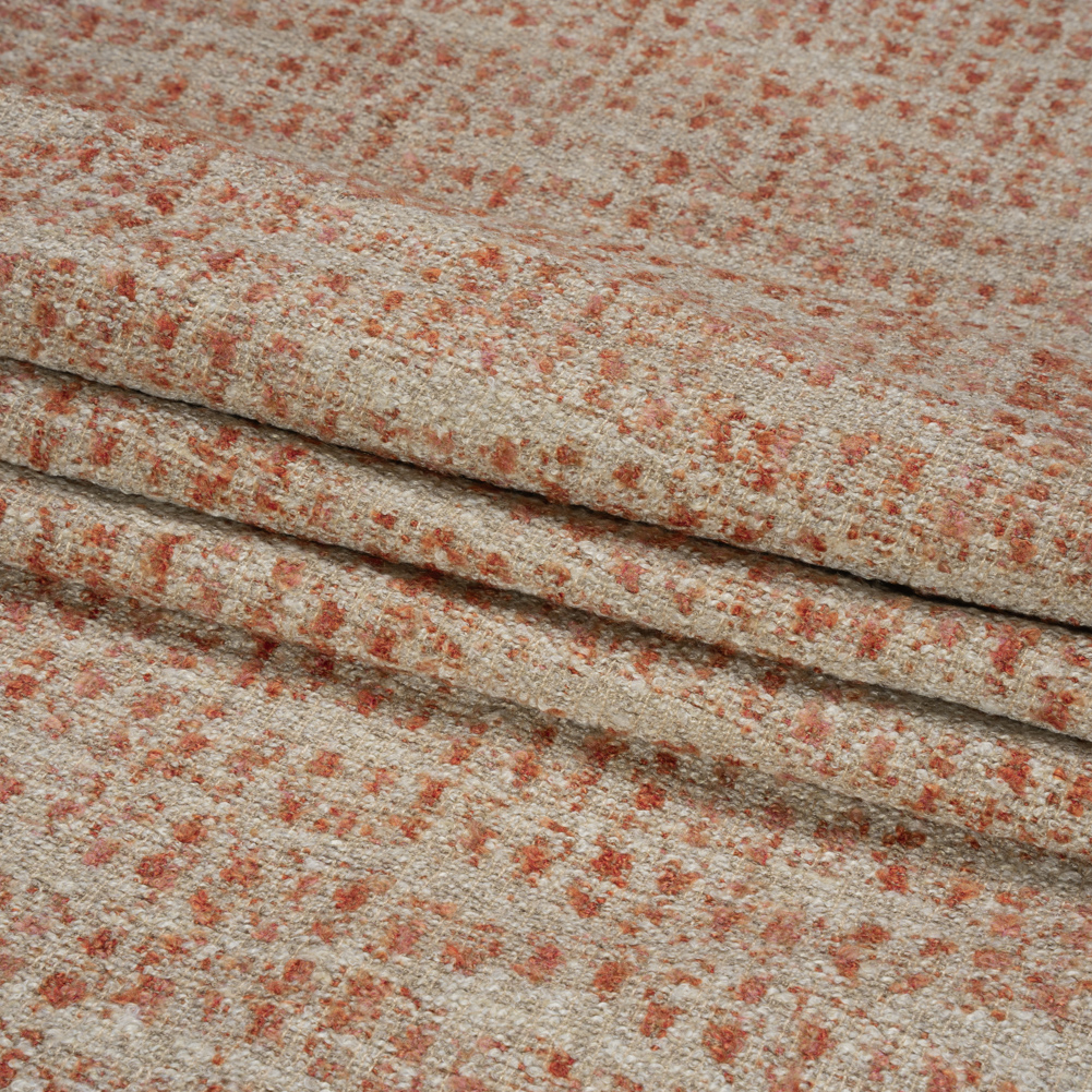 With a pop of sweet color, this iconic Torlea Ruby Tweedy Upholstery Boucle is a gem! Rose and pink yarn speckle a taupe face.