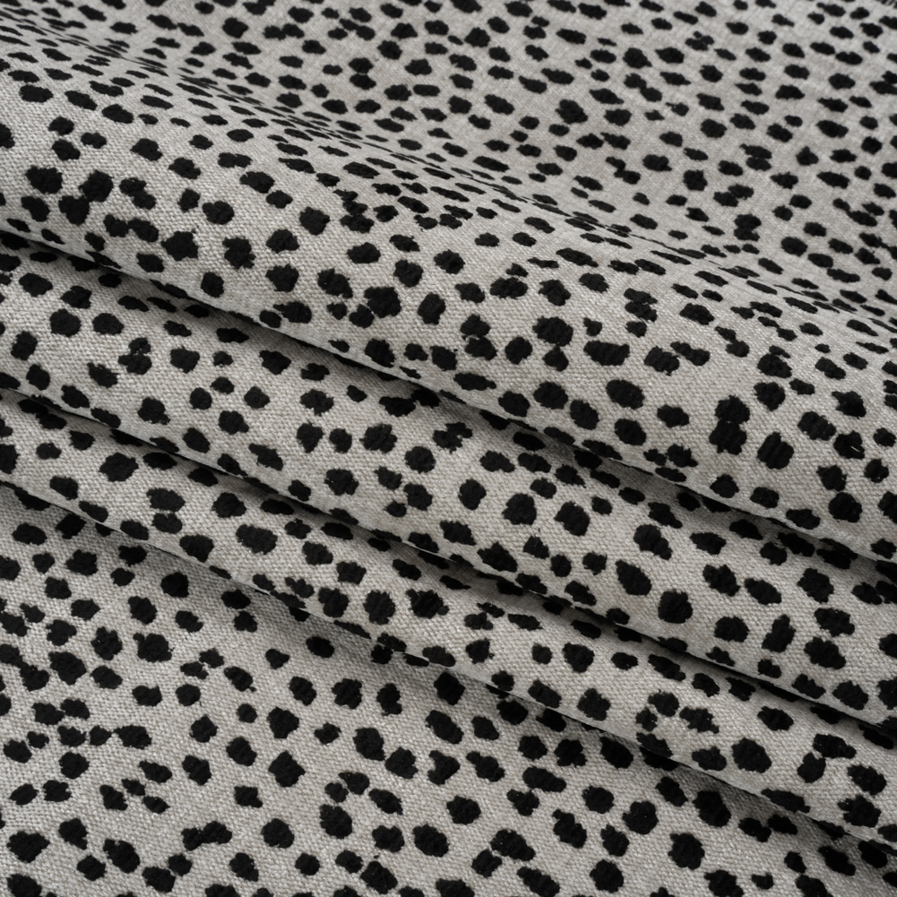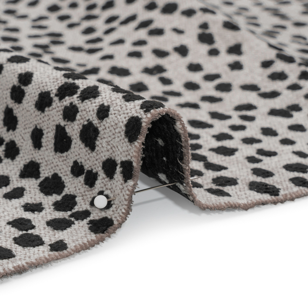 Suit and tie your room together with this Piperhill Tuxedo Spotted Upholstery Chenille! Black, velvety spots rise from the light gray background with the faint pulse of an animal print vibe.