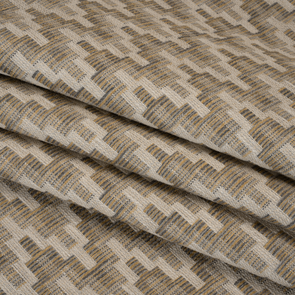 Take a leaf out of our book and use this Leaf Geometric Zig Zags Upholstery Jacquard—featuring a slubbed hand and slightly structured, malleable drape.Suggested Projects: Couches, Armchairs, Ottomans, HeadboardsContent: 67% Polyester, 33% CottonStretch: NoneOpacity: OpaqueGeometric gray and yellow ochre zigzags race across a beige background—lending movement and dimension to your home. Their dimension, recalling the look and feel of embroidery, keeps designers and home sewists alike coming back to Jacquards decade after decade. Thanks to the Jacquard loom, this fabric yields a sophisticated, complex face that applies to upholstery and drapery projects alike. We envision this Jacquard’s slightly structured yet malleable drape and tactile, slubbed hand becoming sleek couches, luxurious sectionals, eye-catching headboards, and ottomans. Mostly opaque, a lining is not necessary.