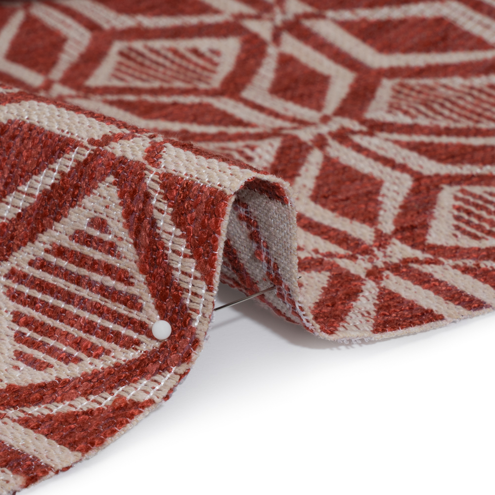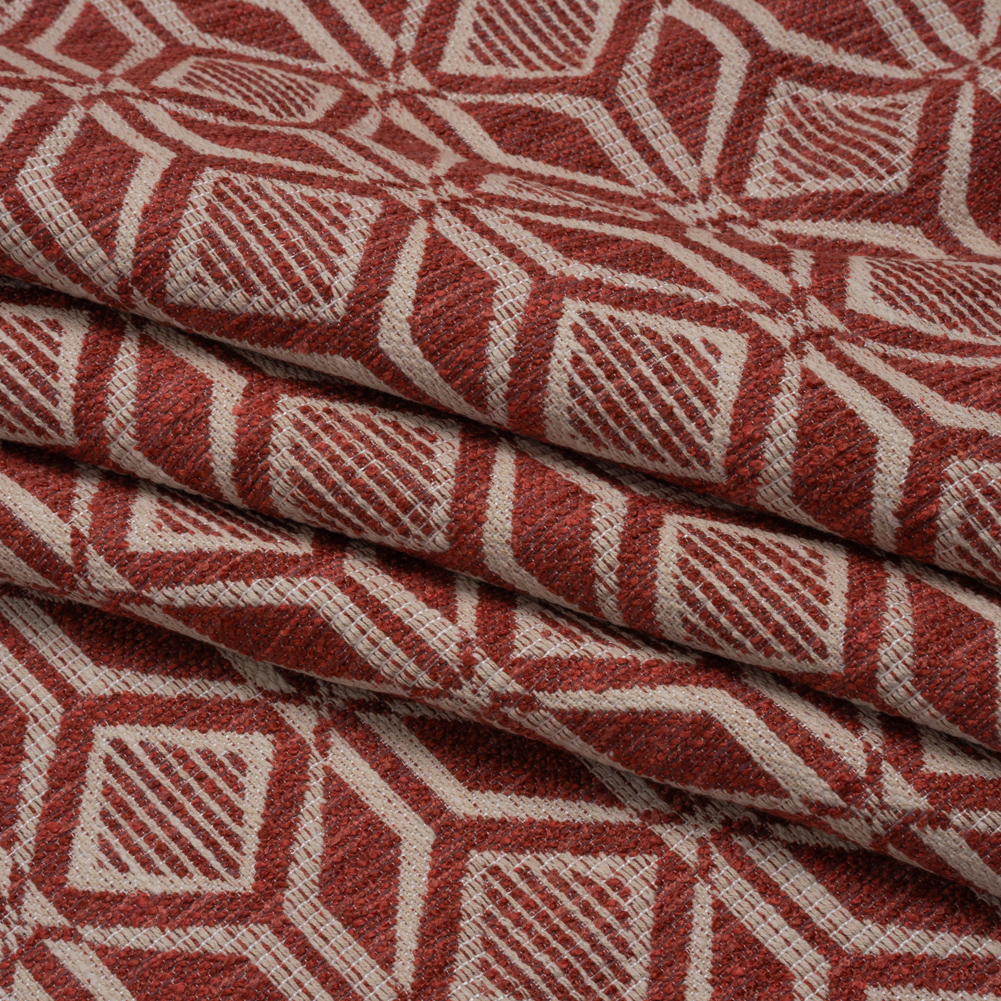 This Ruby Diamonds and Squares Geometric Upholstery Jacquard is a cut above the rest. With a soft, tactile hand and malleable drape, this fabric is sure to stay in style.Suggested Projects: Armchairs, Couches, Ottomans, HeadboardsContent: 81% Polyester, 19% CottonStretch: NoneOpacity: OpaqueCream squares and diamonds rest atop a ruby red backdrop, forming a striking, tile-inspired geometric pattern. With a tactile, slubbed hand and malleable drape, it’s perfect for upholstering armchairs, couches, ottomans, headboards, and beyond! Opaque, a lining is not necessary for most applications. Please note: Due to the nature of the design, about 52” of the 54” width is usable.