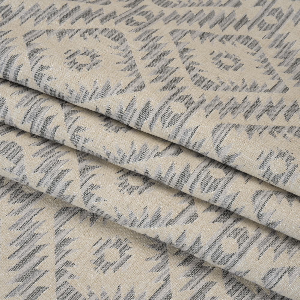 This Stone Southwestern Diamonds Upholstery Jacquard was carved for greatness—featuring a slubbed hand and slightly structured, malleable drape.Suggested Projects: Couches, Armchairs, Ottomans, HeadboardsContent: 65% Polyester, 35% CottonStretch: NoneOpacity: Mostly OpaqueThis beige upholstery jacquard, woven with intricate southwestern diamonds in hues of gray, evokes the timeless spirit of the desert, where earthy hues and geometric patterns echo the vast, sun-drenched landscapes of the American Southwest. Their dimension, recalling the look and feel of embroidery, keeps designers and home sewists alike coming back to Jacquards decade after decade. Thanks to the Jacquard loom, this fabric yields a sophisticated, complex face that applies to upholstery and drapery projects alike. We envision this Jacquard’s slightly structured yet malleable drape and tactile, slubbed hand becoming sleek couches, luxurious sectionals, eye-catching headboards, and ottomans. Mostly opaque, a lining is not necessary.