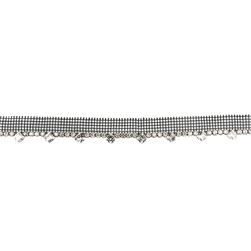 It’s like the north star is pointing you right to this premium Crystal and Silver Circular Rhinestone Trimming on Black Mesh with Triangular Rhinestone Fringe! A single row of round crystal rhinestones in silver settings is interrupted every few stones by a larger diamond-shaped stone that hangs just off the edge of the black mesh lip.