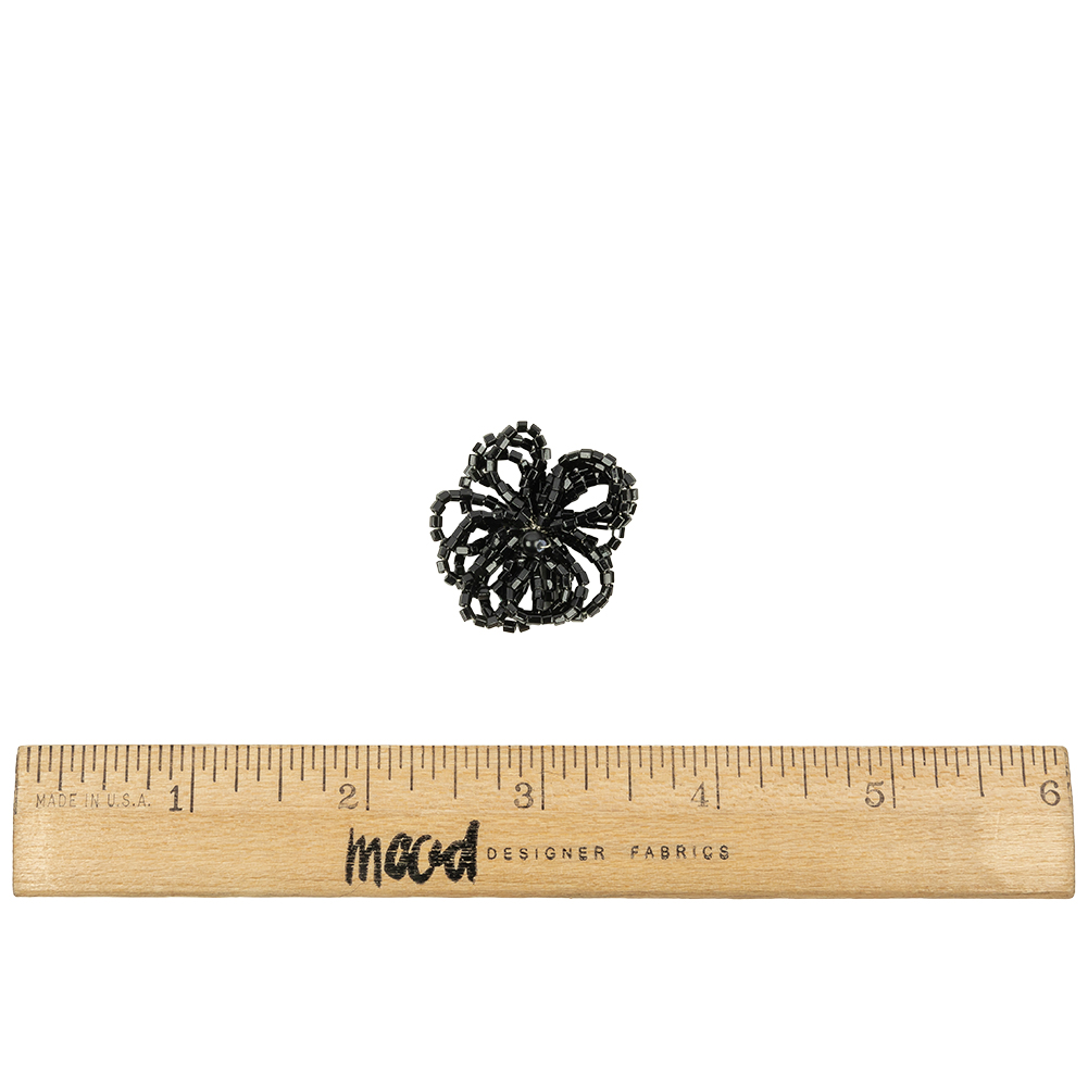 Vintage Jet Black Seed Beaded Flower Decoration with Black Faux Pearl Center - 1.25" x 1.25"
