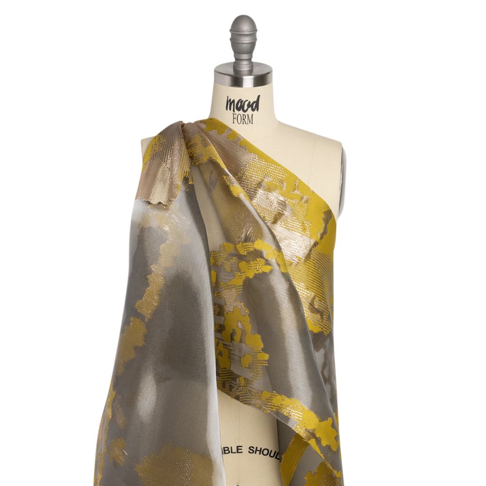 All that glitters is gold with this Yellow and Black Metallic Abstract Luxury Burnout Brocade! Opaque metallic gold and mustard yellow sections float like islands on a sheer black sea, created by a chemical process (called burnout) that dissolves the cellulose fibers to create a pattern. The result is a multi-textured face with a high visual appeal—and the easiest route to opulence. Bring its semi-structured drape to gowns and skirts as an overlay for an elegant effect of voluminous proportions. For an added oomph of luxury, we suggest adding our silk habotai linings.
