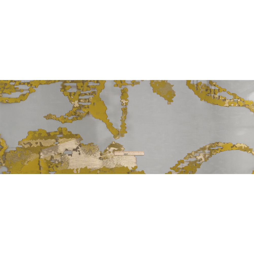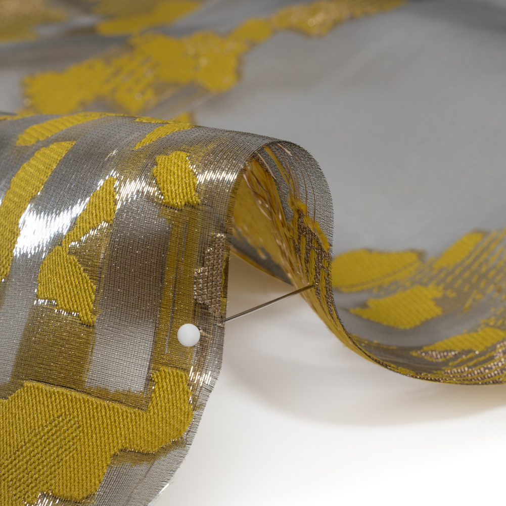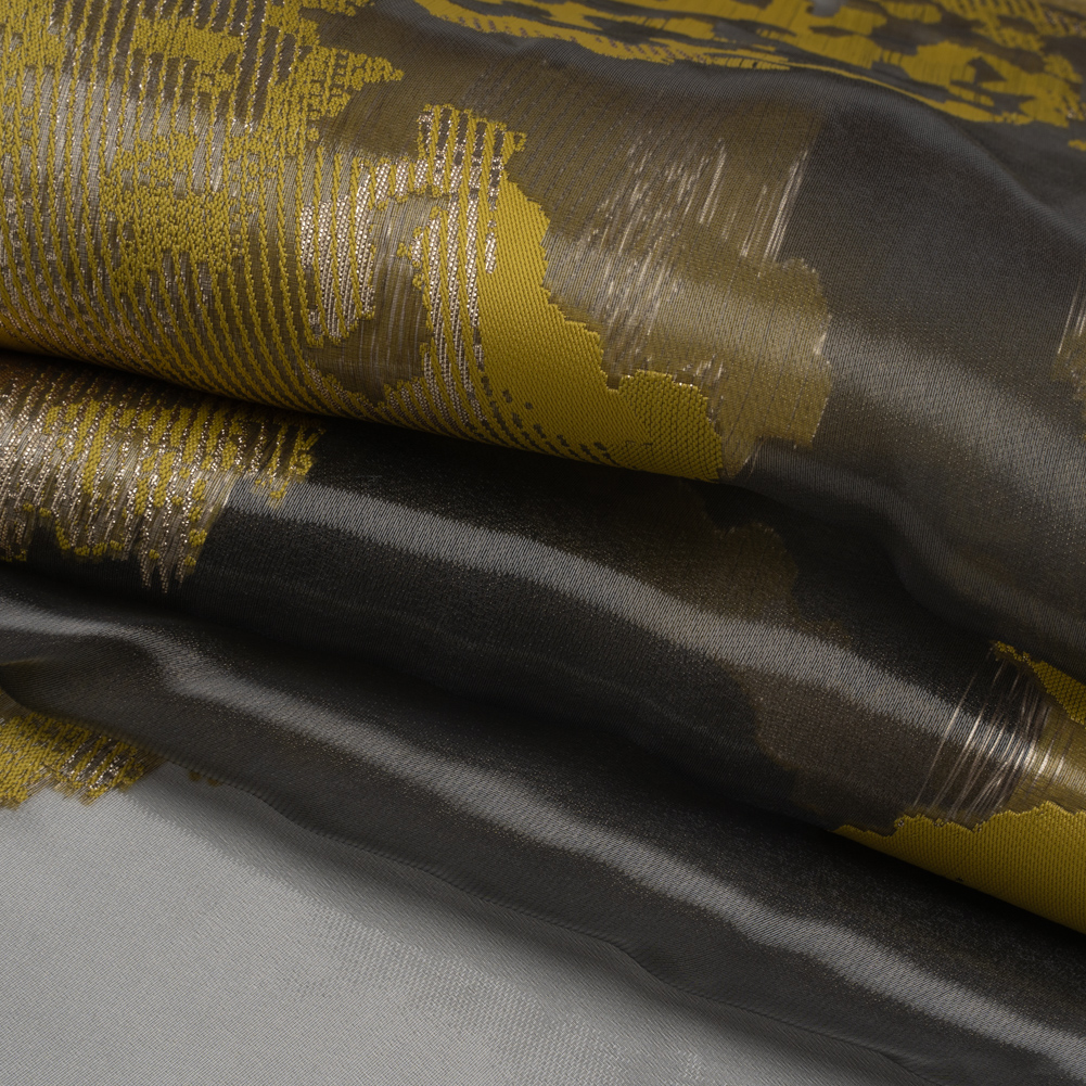All that glitters is gold with this Yellow and Black Metallic Abstract Luxury Burnout Brocade! Opaque metallic gold and mustard yellow sections float like islands on a sheer black sea, created by a chemical process (called burnout) that dissolves the cellulose fibers to create a pattern.