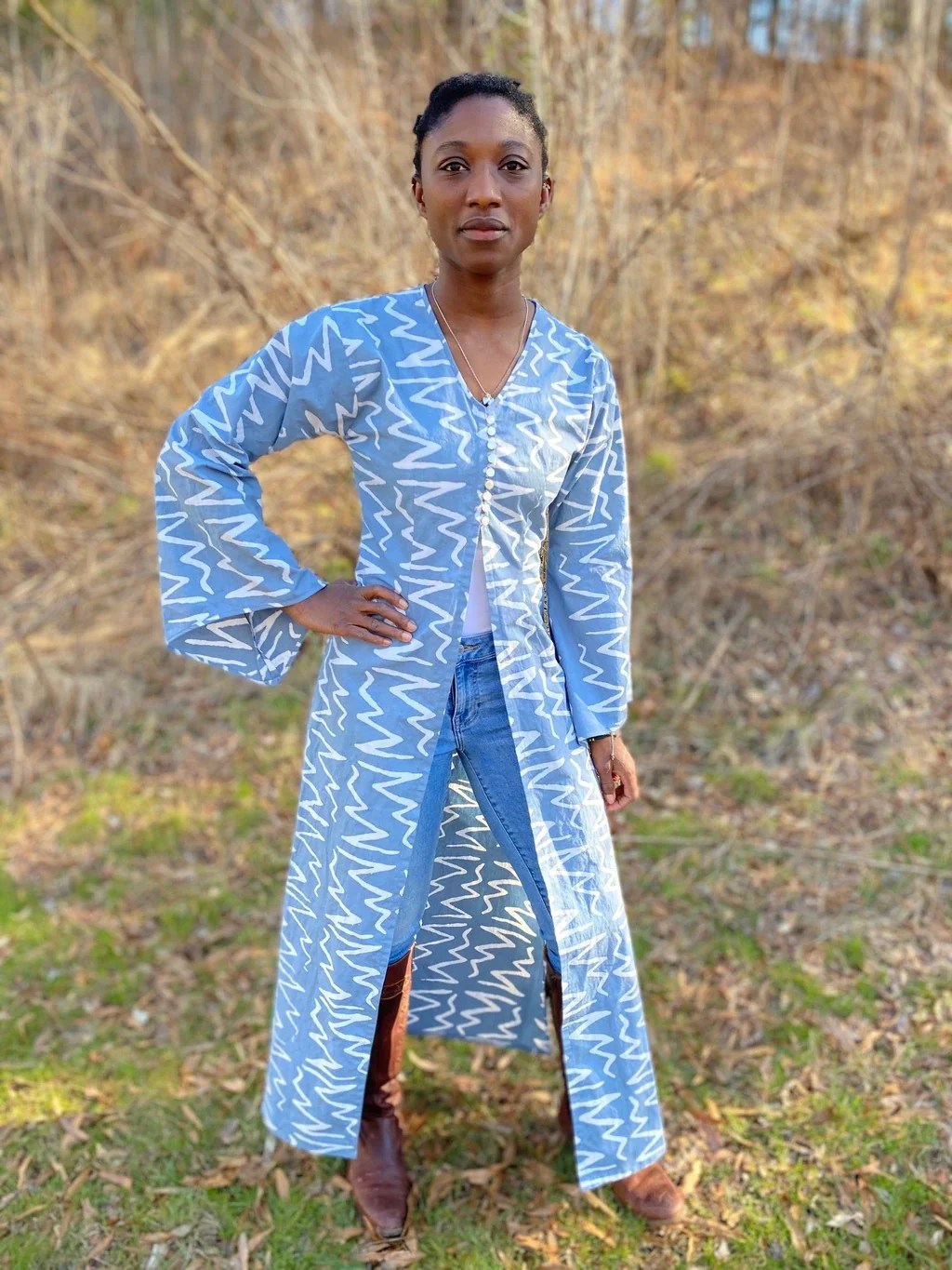 The Entari (or robe) features optional waist-shaping darts, plunging v-front neckline, button loop front closures, flowing bell sleeves, and free floating ankle length panels. It can be worn as a gown under the vest or as a coat to wear as top layer.