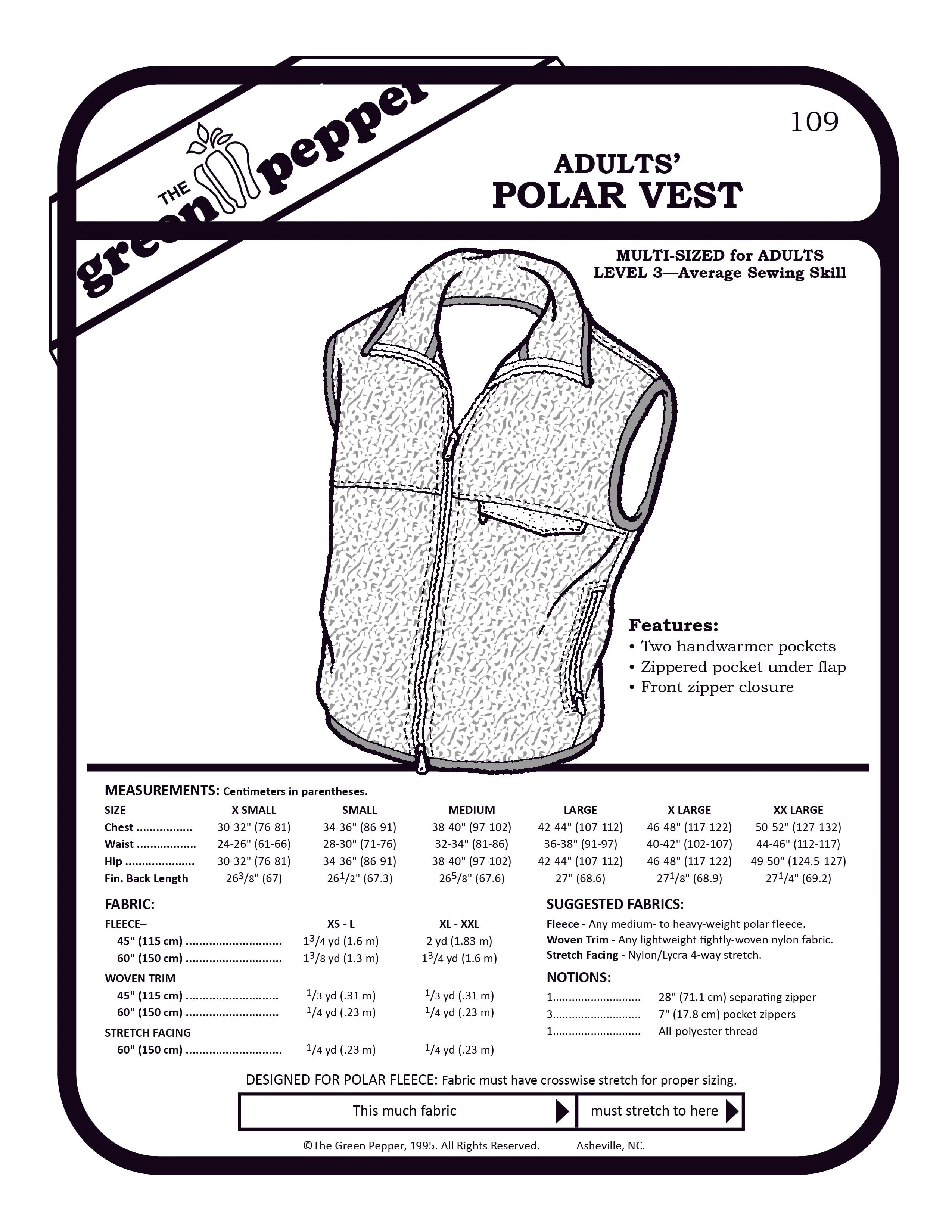 Stay warm and cozy when working outside!Our popular pattern to make this polar fleece vest has several key features:  two handwarmer pockets, zippered pocket under chest flap (won't loose your keys), and a front zippered closure.  This pattern uses little fabric (2 yards or less!). This pattern is designed for polar fleece, which must have crosswise stretch for proper sizing.