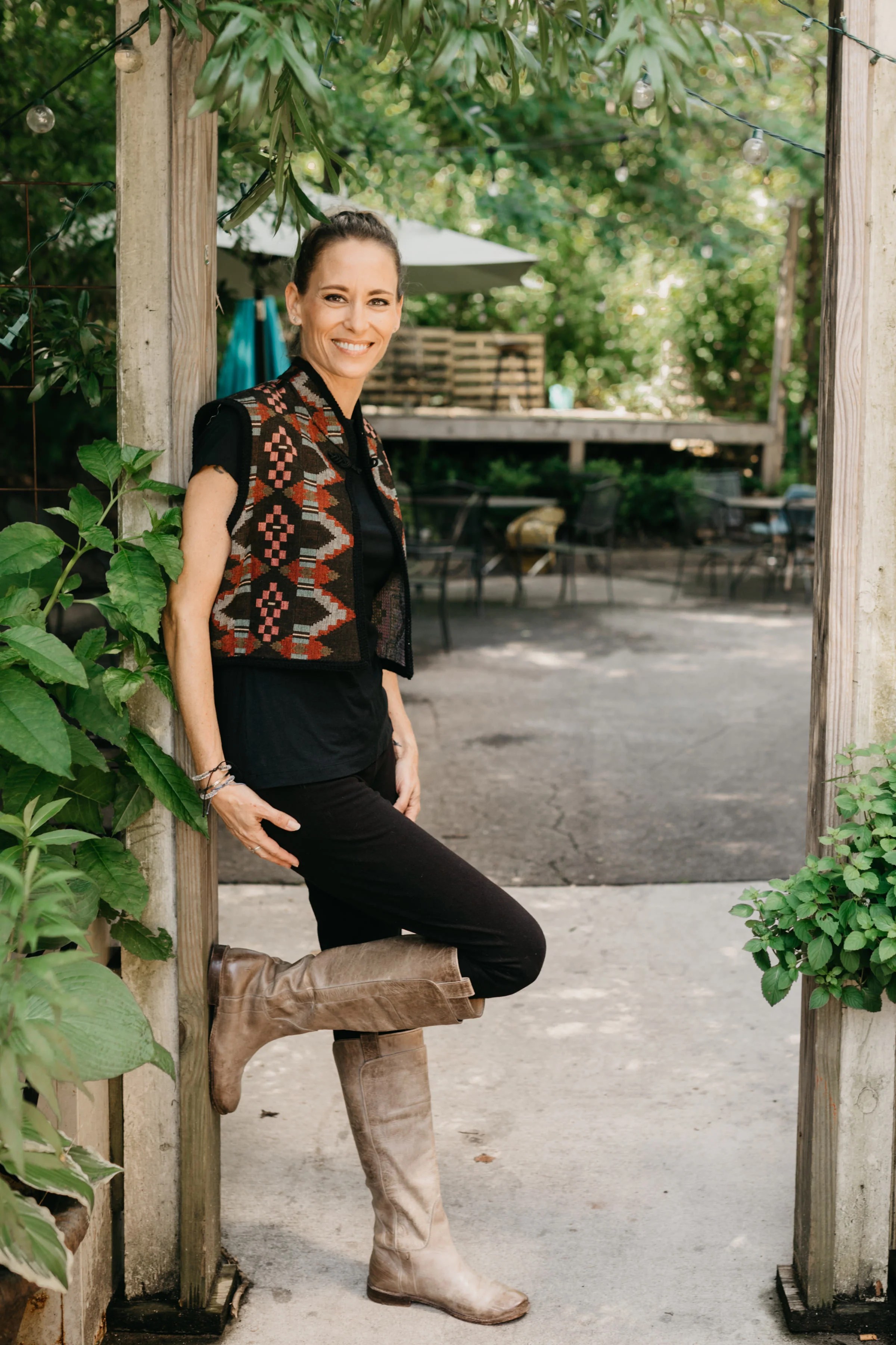 The panels of the long Greek vest flare gracefully from a slightly raised waist. As on many Greek coats and vests, the front opening does not meet, but frames the body. Narrow shoulders and a uniquely pieced back construction are accented by a small pleat on either side of the back and small side slits at the hemline. With or without lining, fold-over braid is used for finishing.