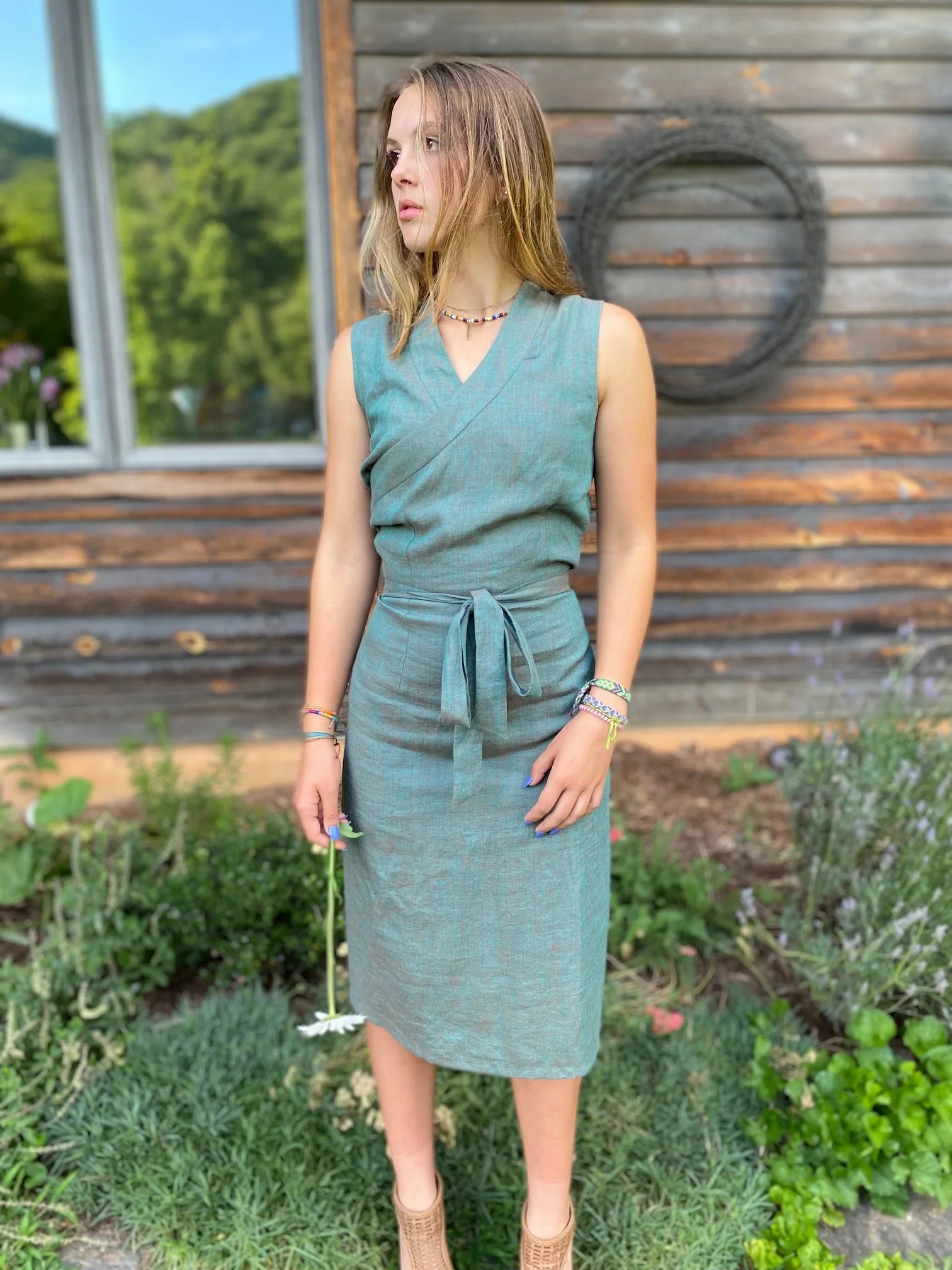 This Tibetan Chupa wrapped jumper has a centuries-long history in Tibet. It is traditionally worn with added layers of aprons, woolen sashes, and a panel coat (like our 118 Tibetan Panel Coat). Worn alone or with a blouse (like our 111 Nepali Blouse), the Chupa is a beautiful contemporary garment.