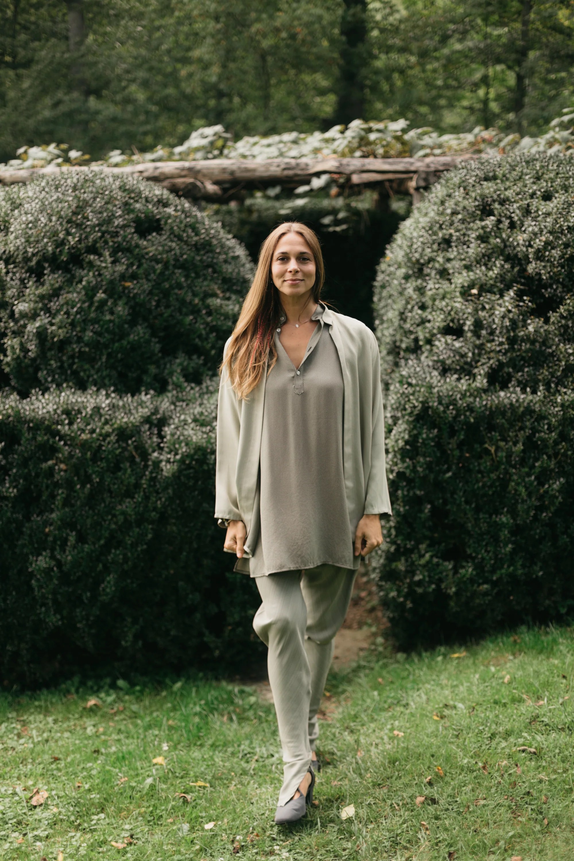 The Kurta, sized here for both men and women, is a mid-thigh, long-sleeved overshirt gently flared from the natural shoulder line, with side slits at the hem, neckband, placket, breast, and sideseam pockets.