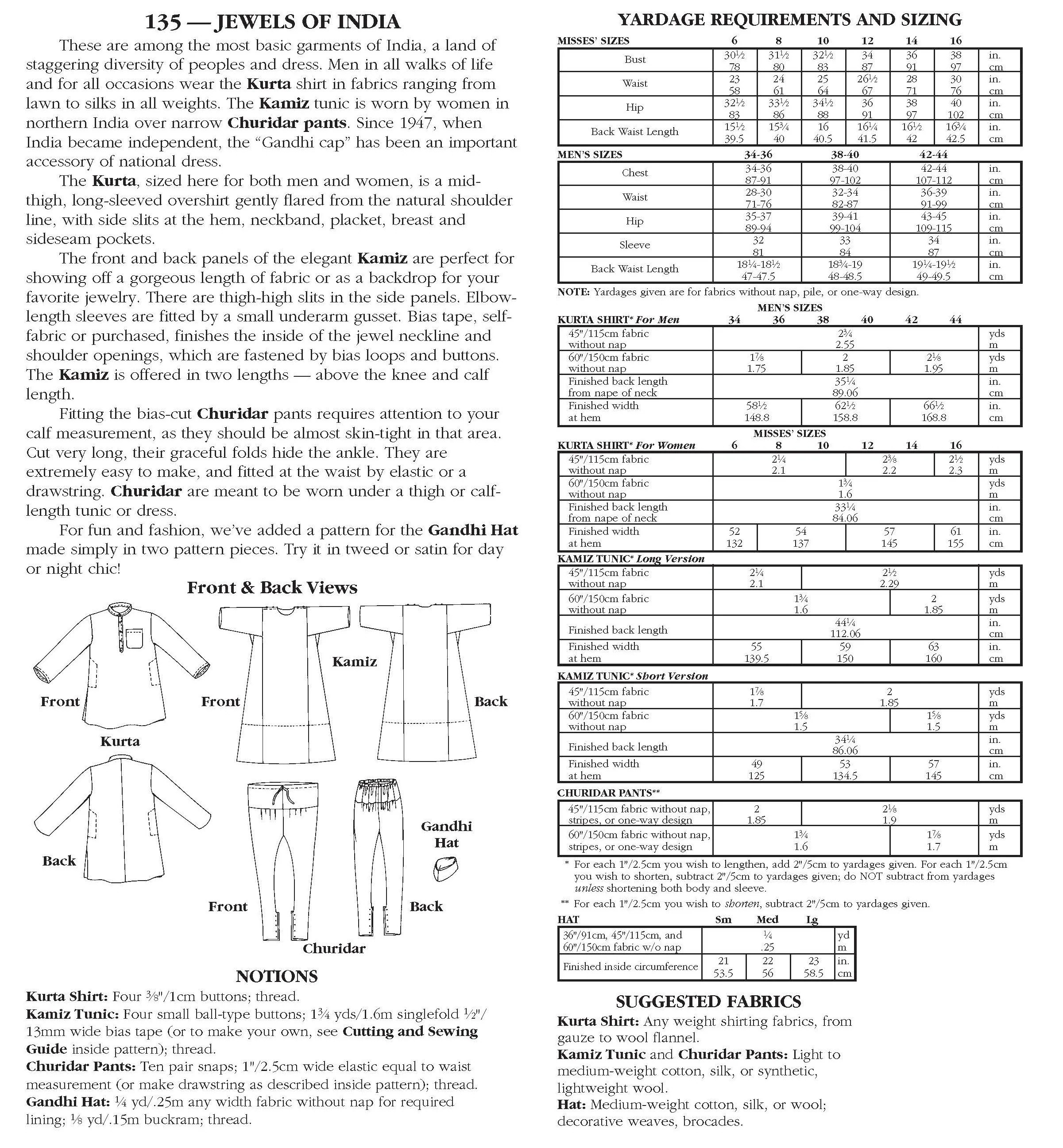 Traditional Indian clothing patterns feature a grouping of truly versatile garments with a tailored Kurta overshirt for men and women, Kamiz tunic and bias-cut Churidar pants for women. The simple shapes of these garments make it easy to vary them creatively. Top everything off with the Gandhi hat, a symbol of national pride since 1947. This pattern includes historical information about Indian dress.