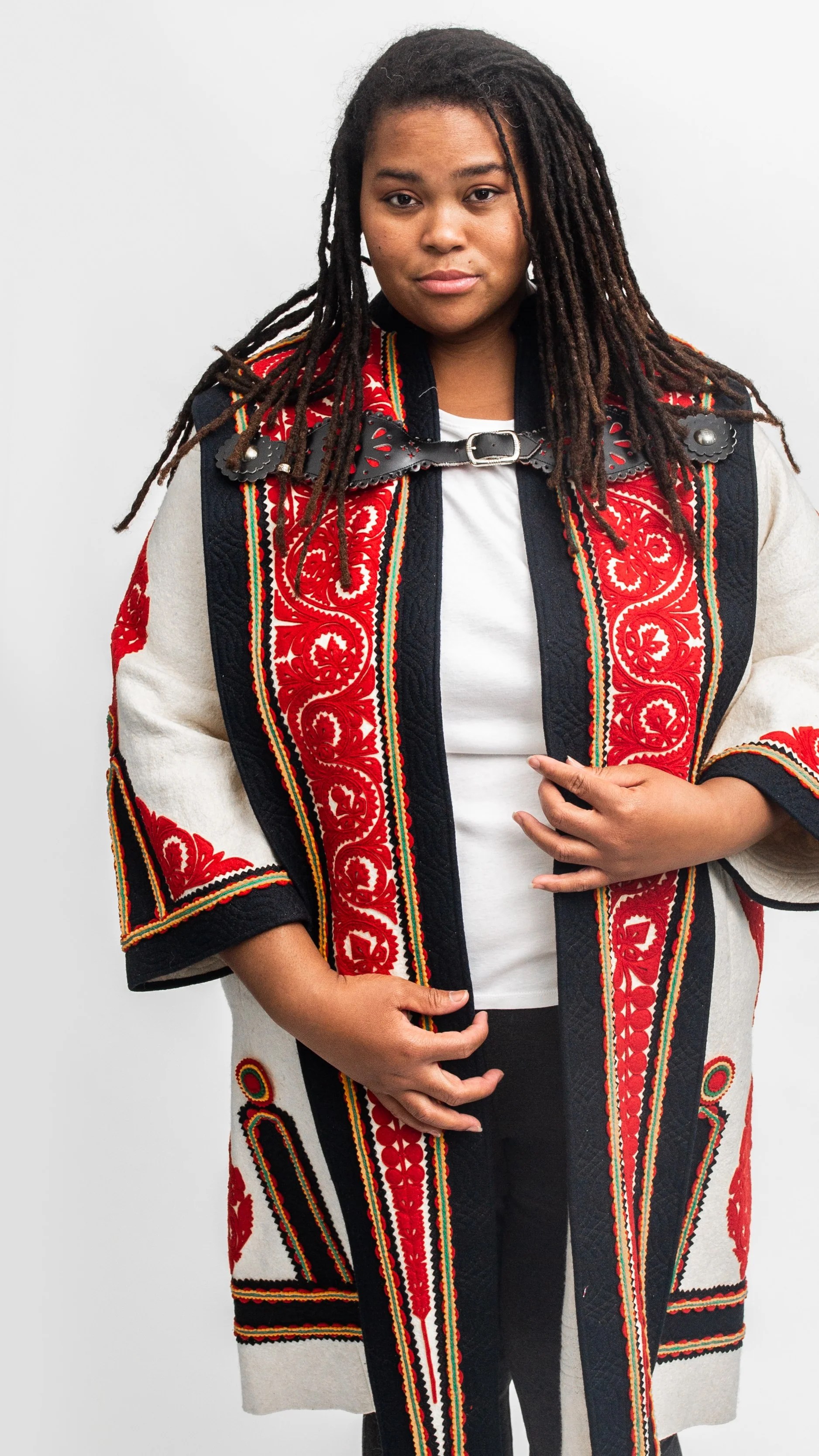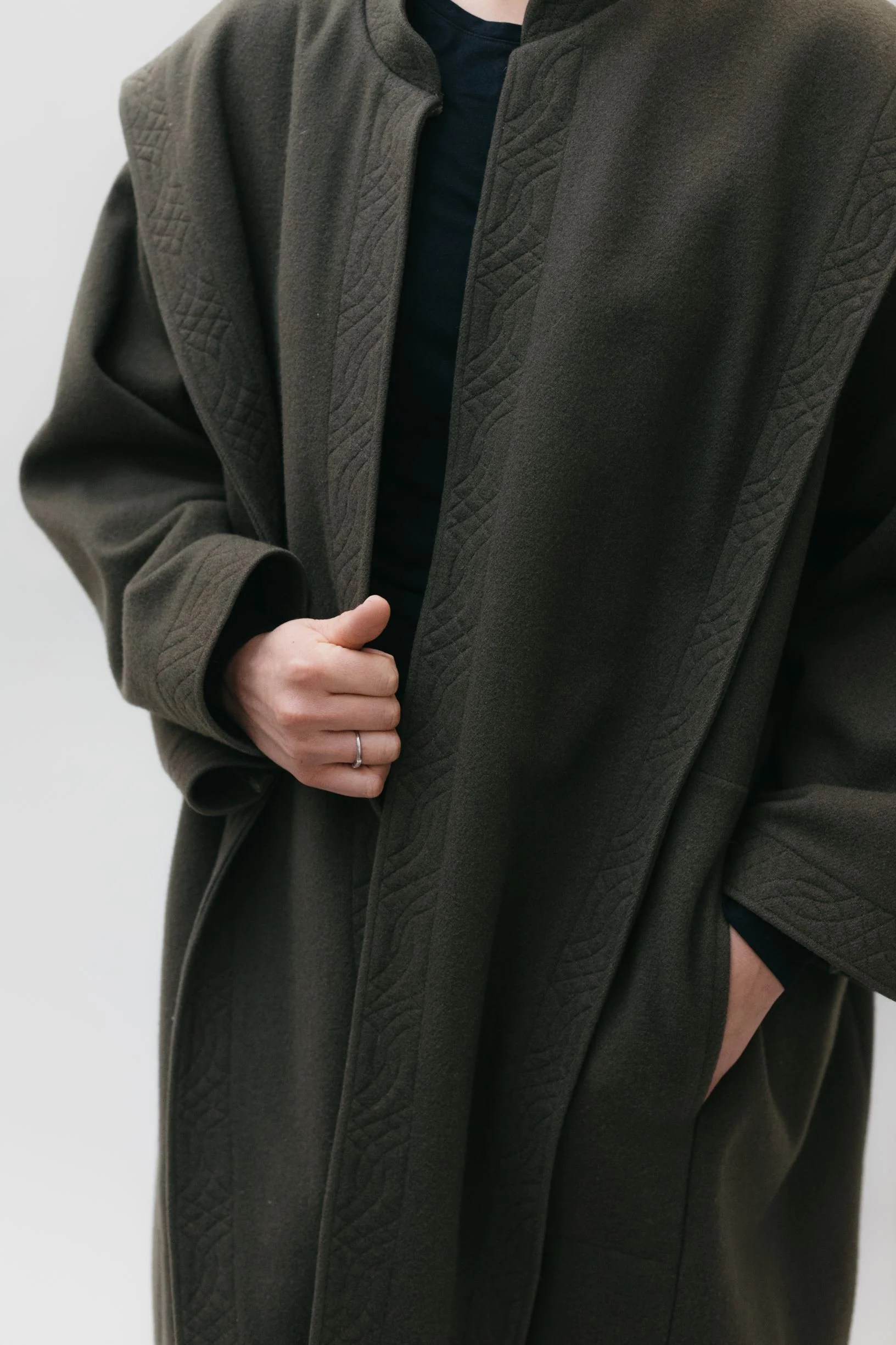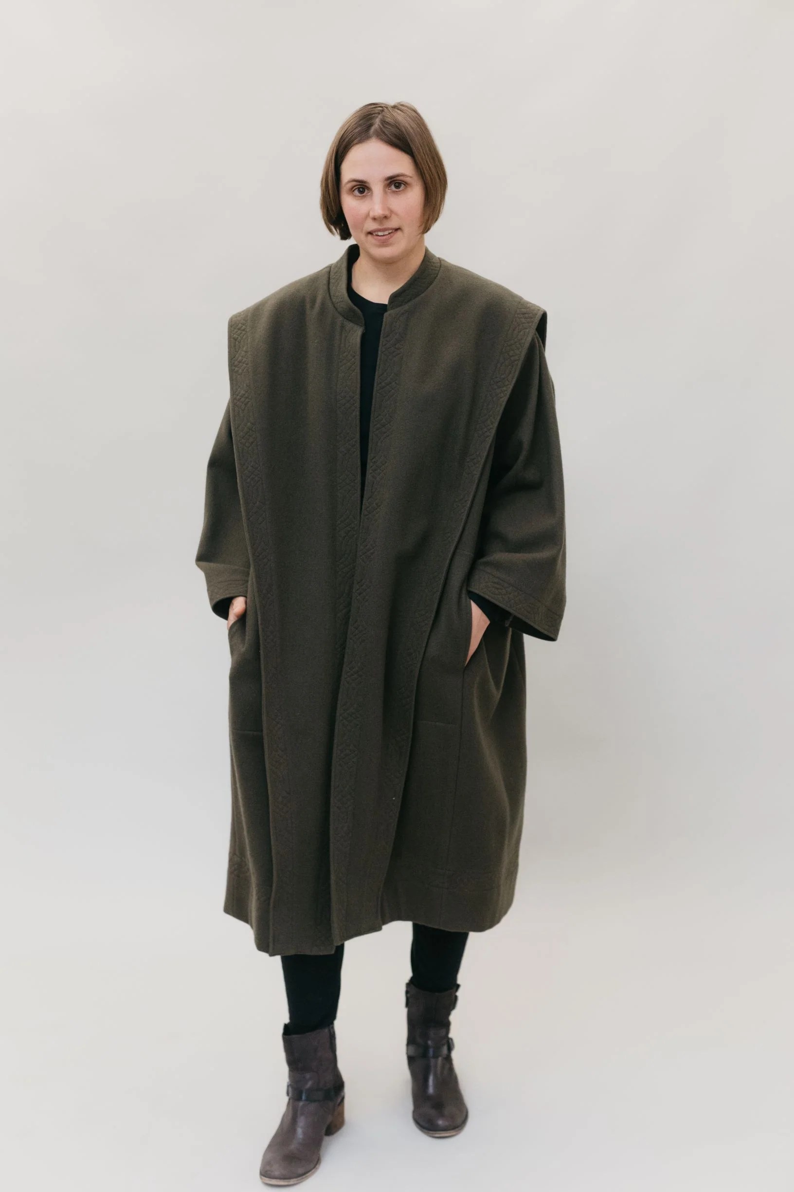 View B is a more contemporary version of the pattern that includes pockets, a lined lapel and collar back, and finished hems on the sleeves and bottom. This view eliminates the decoration, elaborate buckle closure and back vent.