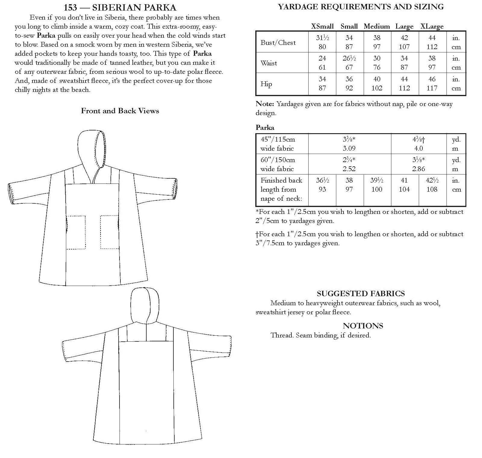 This extra-roomy, easy-to-sew Siberian Parka pulls on easily over your head when the cold winds start to blow. Based on a smock worn by men in western Siberia, we've added pockets to keep your hands toasty, too. This type of Parka would traditionally be made of tanned leather, but you can make it of any outerwear fabric, from serious wool to up-to-date polar fleece. And, made of sweatshirt fleece, it's the perfect cover-up for those chilly nights at the beach.