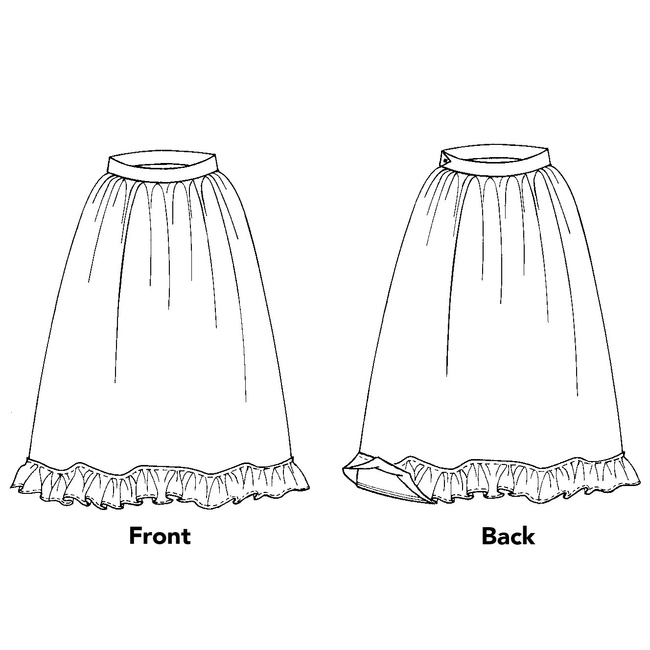 The slimming effect of the skirt is due to a concentration of the quilting in the lower part of the skirt, while the upper skirt section is lined with fabric alone. Ours falls in gathers from a narrow waistband with a placketed side opening. It may be cut ankle or calf length. View A uses commercial pre-quilted fabric; View B and C may be machine or hand quilted: View C has more elaborate quilting design and no ruffle.