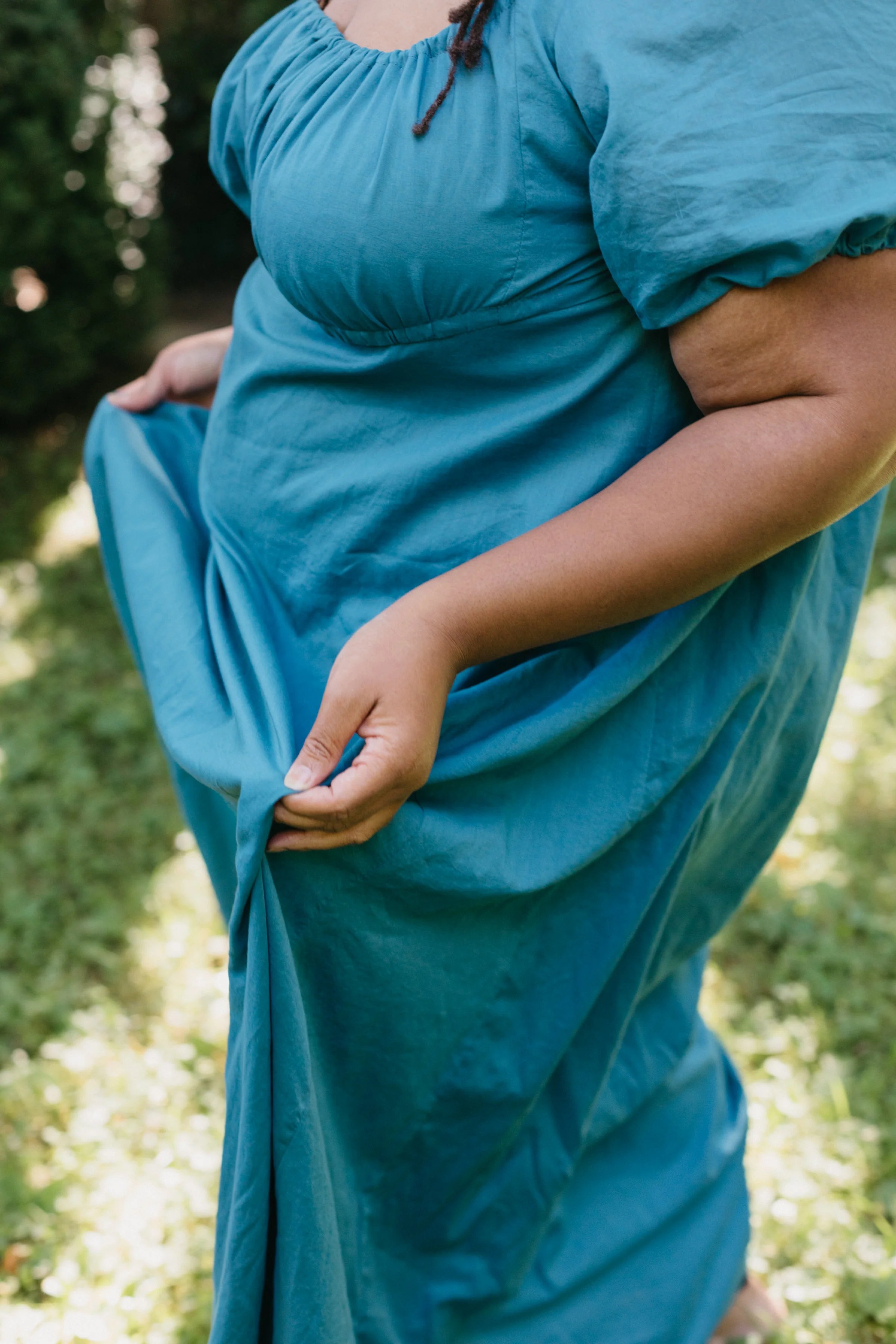 Folkwear presents a sewing pattern for this classic in three lengths, with two sleeve options. A narrow bodice is gathered into a slim A-line skirt front and side panels, and full gathered skirt back that falls to just below knee length, full length, or full length with train for weddings or formal wear.